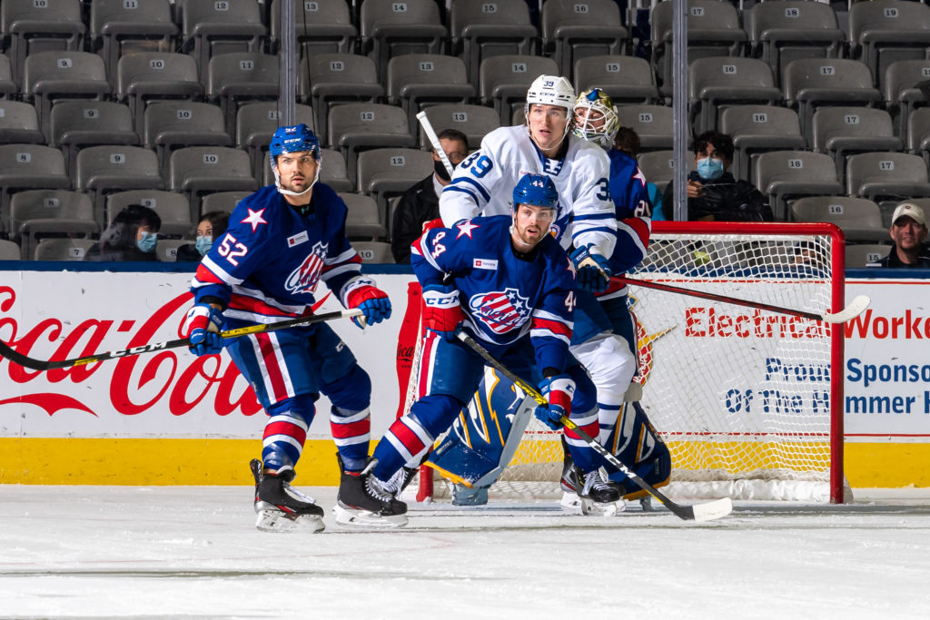 OCTOBER 23, 2021 – TORONTO ONTARIO CANADA – The Toronto Marlies, AHL affiliate of the NHL Toronto Maple Leafs, take on the Rochester Americans (NHL Buffalo Sabres) at the Coca-Cola Coliseum in Toronto, Ontario. (Photo credit: Christian Bonin/TSGphoto.com)