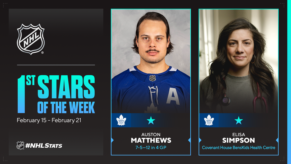NEW YORK – Toronto Maple Leafs center Auston Matthews and Covenant House BensKids Health Centre lead nurse Elisa Simpson have been named the NHL’s “First Stars” for the week ending Feb. 21.