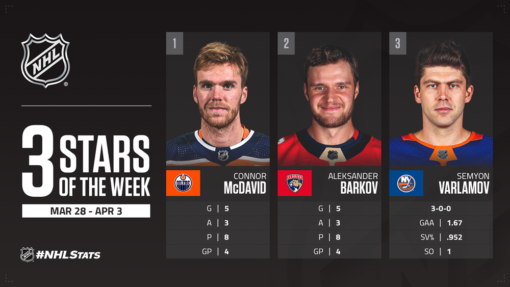 NEW YORK – Edmonton Oilers center Connor McDavid, Florida Panthers center Aleksander Barkov and New York Islanders goaltender Semyon Varlamov have been named the NHL’s “Three Stars” for the week ending April 3.
