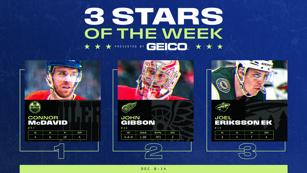 NEW YORK – Edmonton Oilers center Connor McDavid, Detroit Red Wings goaltender John Gibson and Minnesota Wild center Joel Eriksson Ek have been named the NHL’s “Three Stars” presented by GEICO for the week ending Dec. 14.