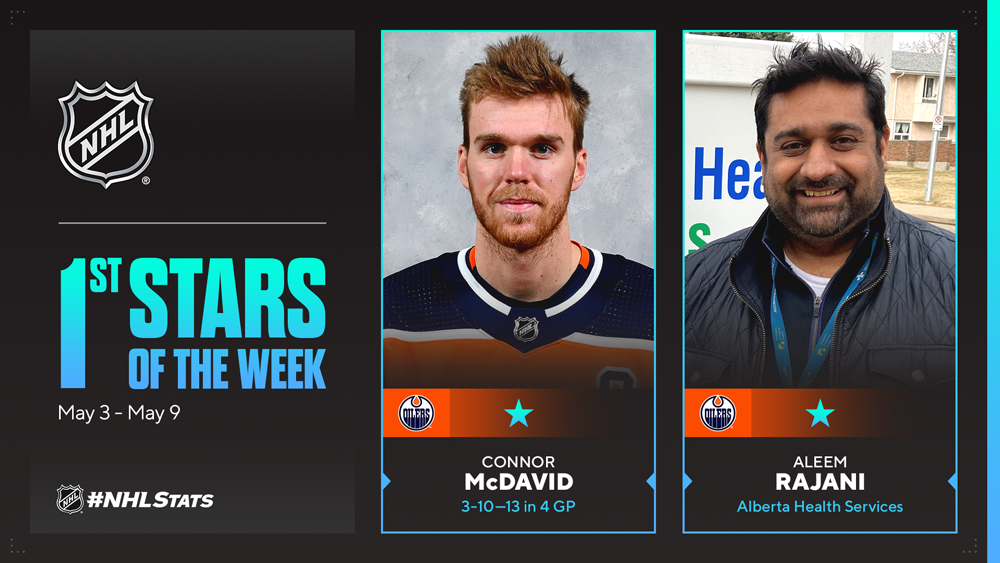 NEW YORK – Edmonton Oilers center Connor McDavid and Alberta Health Services program manager Aleem Rajani have been named the NHL’s “First Stars” for the week ending May 9.