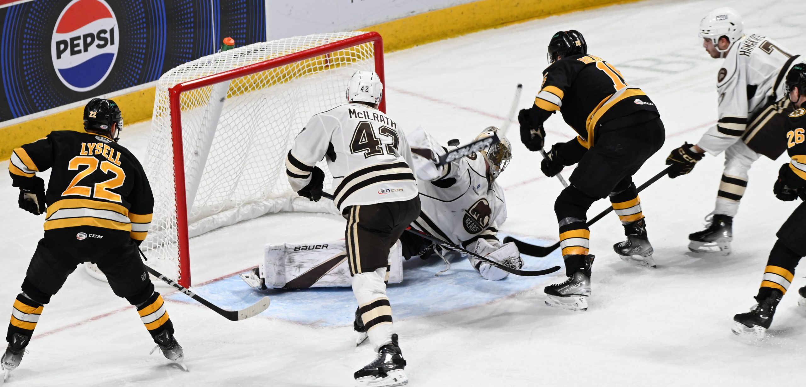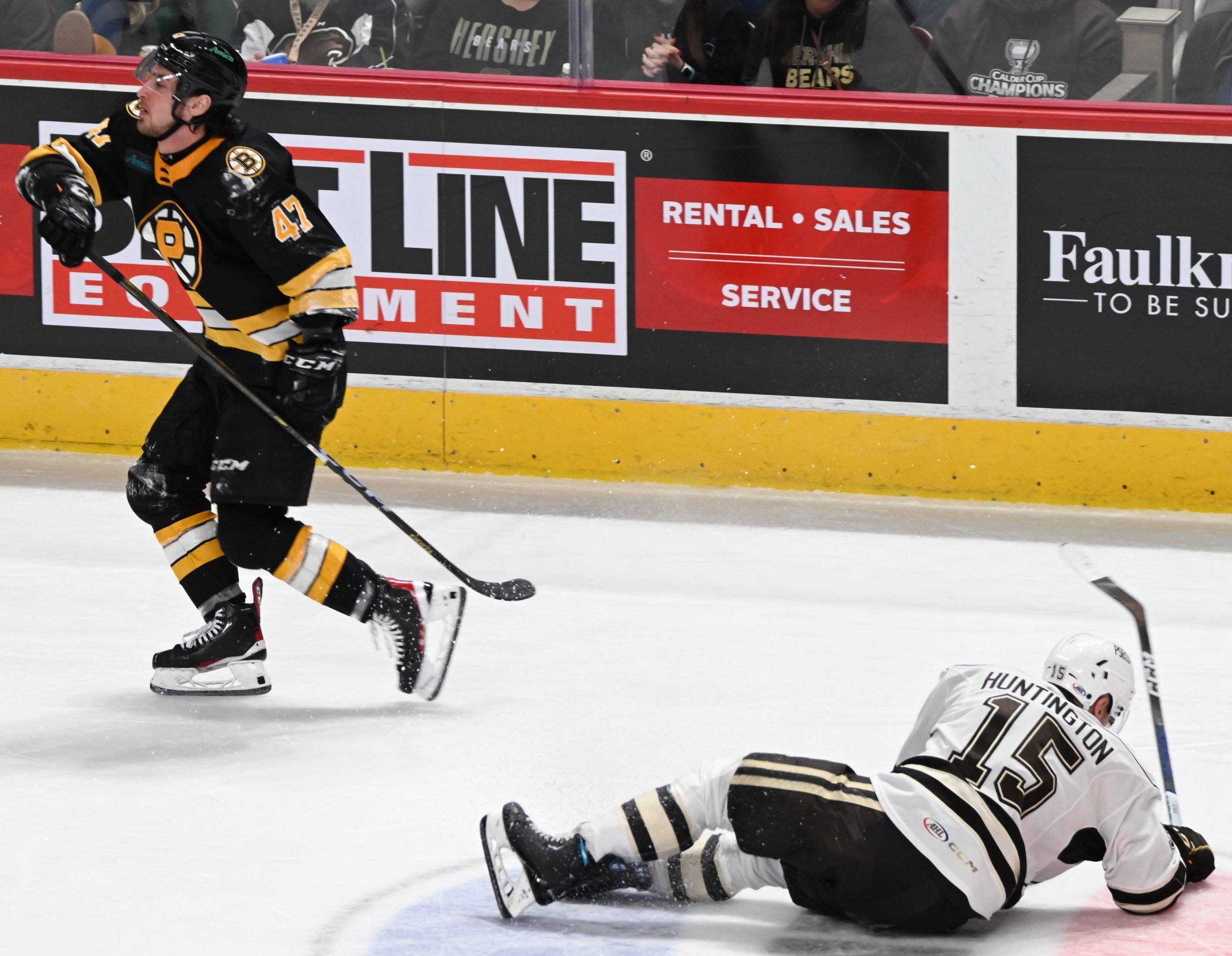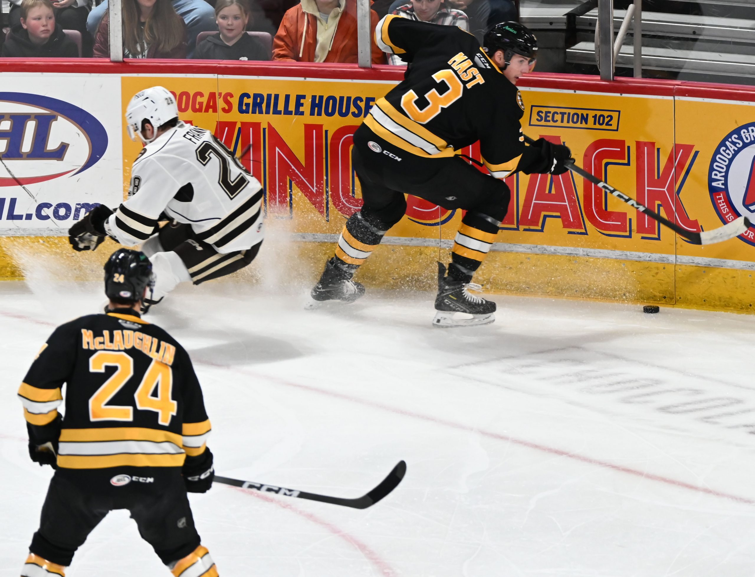 Dylan McIlrath enjoyed the second two-goal game of his career and the Hershey Bears (24-6-0-0) triumphed over the Providence Bruins (14-12-2-2) by a 4-3 score on Saturday night in front of a crowd of 9,601 at GIANT Center to head into the American Hockey League’s holiday break atop the league standings and riding a five-game winning streak.