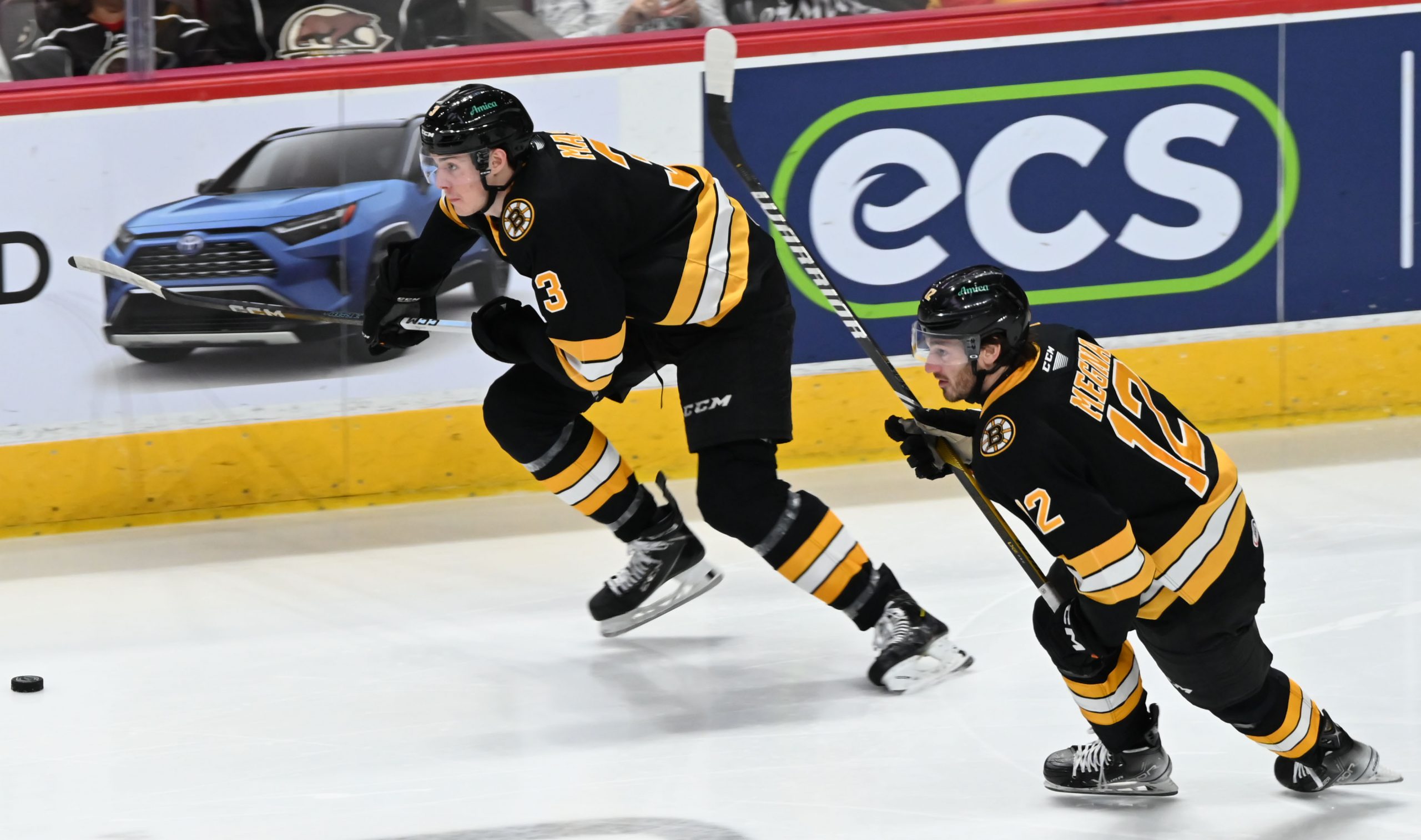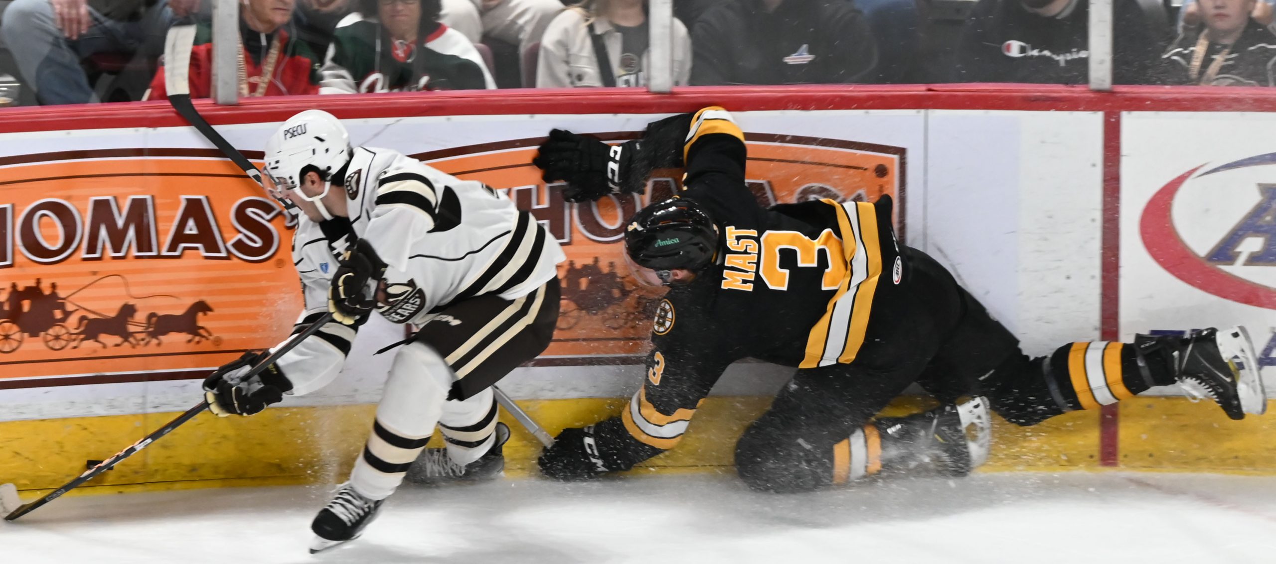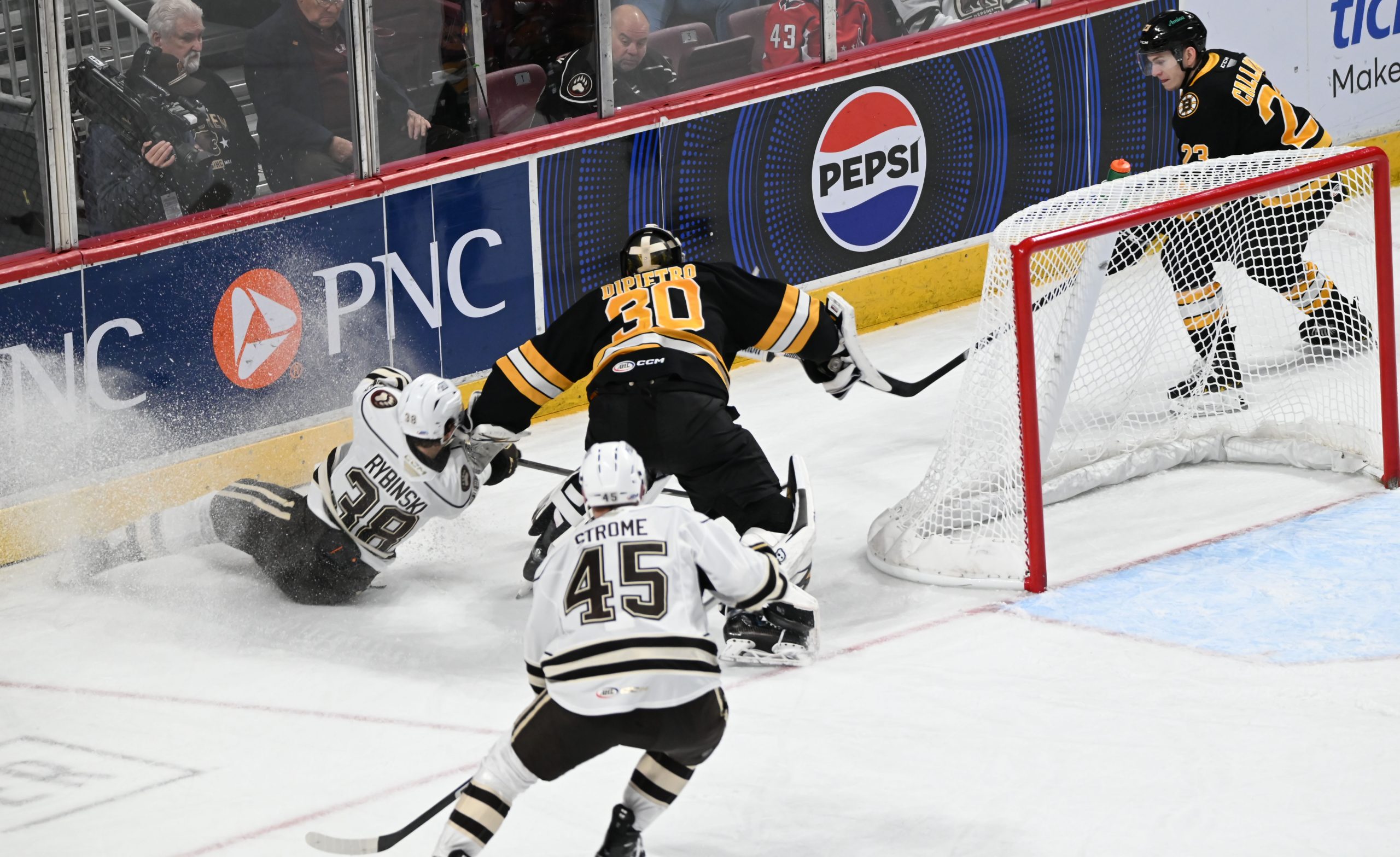 The Bruins tied the score early in the second period as Joey Abate forced a turnover as Clay Stevenson attempted to play the puck in the trapezoid, and Abate found Marc McLaughlin, whose shot was knocked in by Vincent Arseneau at 2:06.