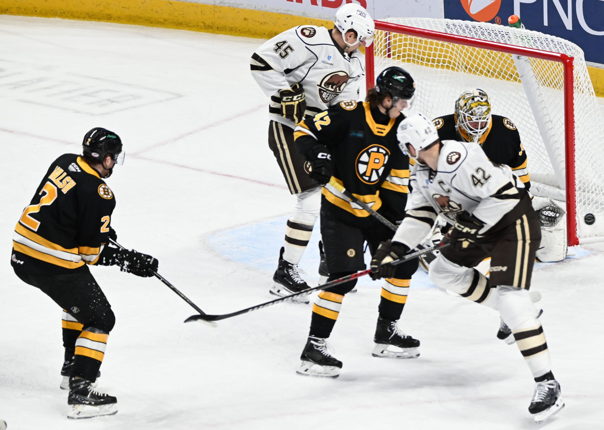 Hershey restored the two-goal lead early in the third period when Priskie found Pierrick Dube in the slot, and the forward’s one-timer banked off the equipment of DiPietro and a Providence defender into the cage at the 2:08 mark for his 16th of the season. Garret Roe picked up an additional assist on the goal. For Dube, the goal moved him into a tie with Springfield’s Adam Gaudette and Rochester’s Jiri Kulich for the AHL’s goal-scoring lead.