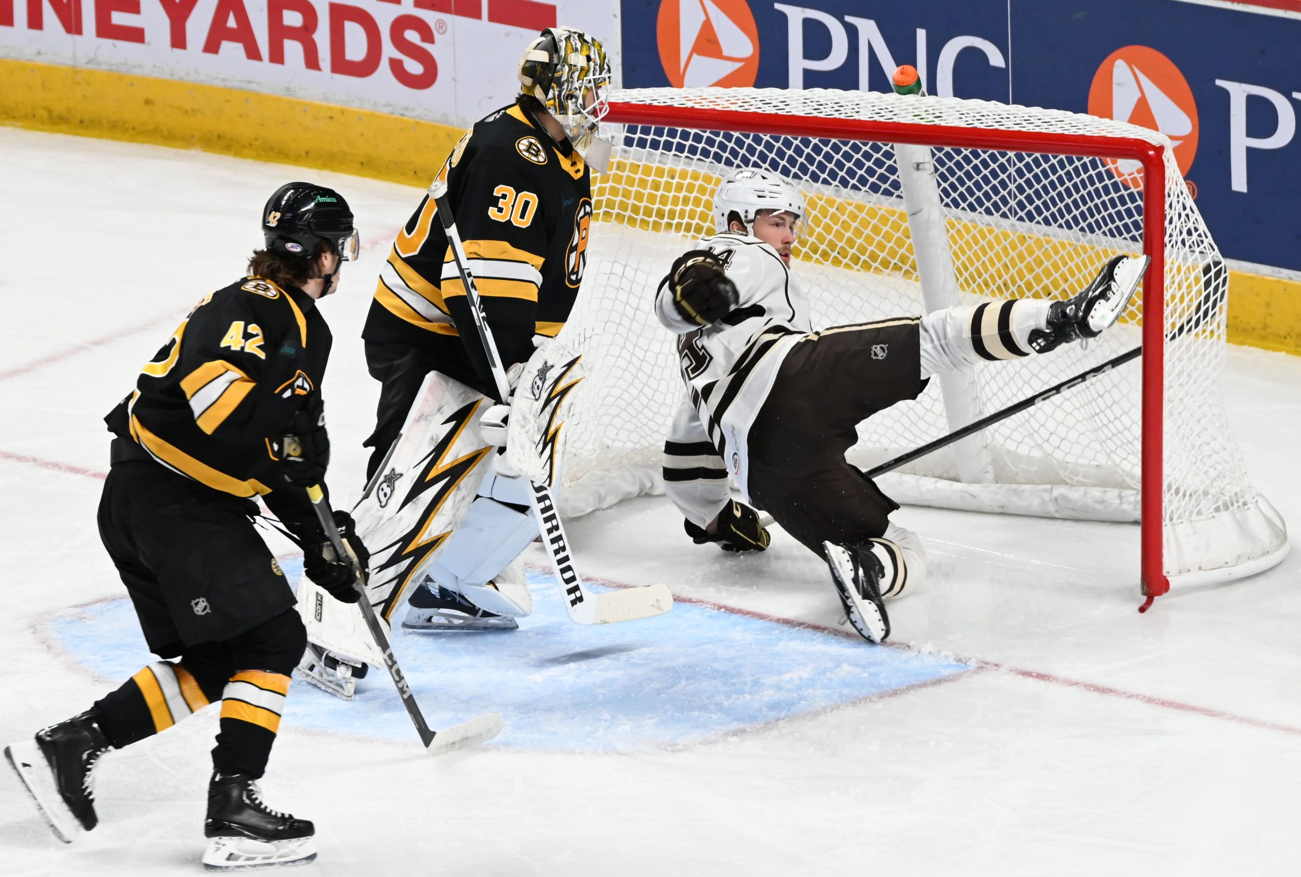 The Bruins tied the score early in the second period as Joey Abate forced a turnover as Clay Stevenson attempted to play the puck in the trapezoid, and Abate found Marc McLaughlin, whose shot was knocked in by Vincent Arseneau at 2:06.