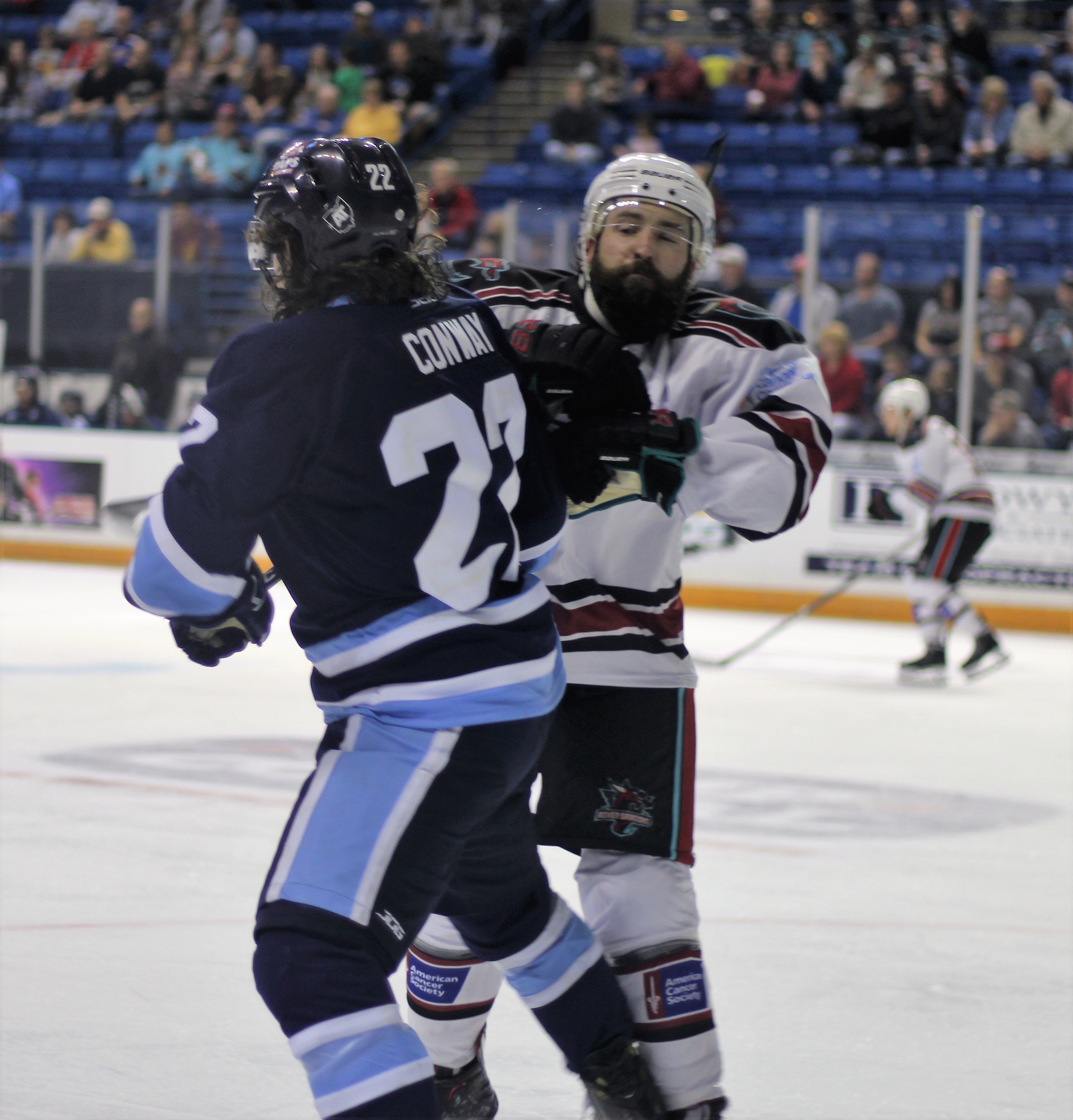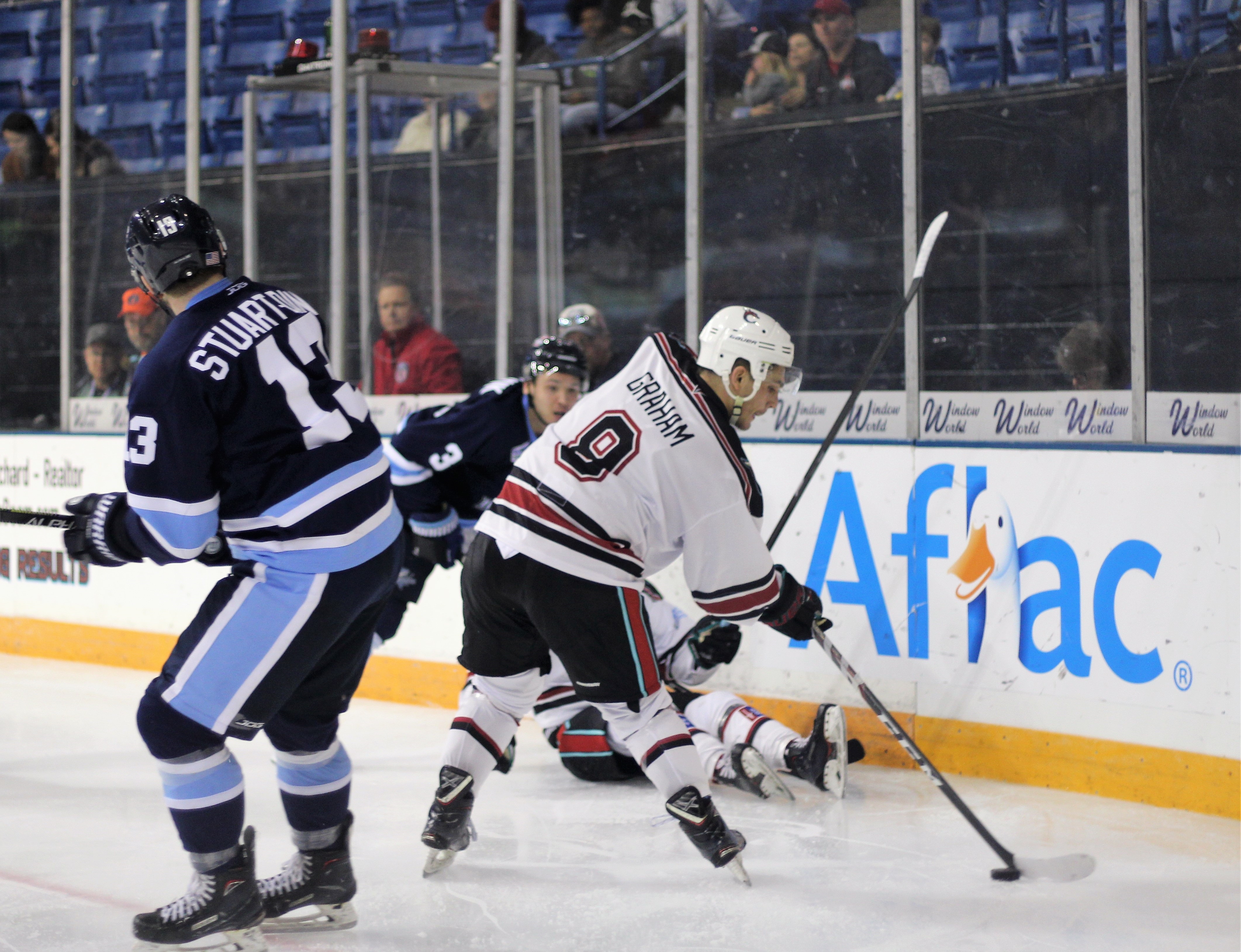 Columbus would again draw within one as MJ Graham played a puck from behind the net and he faked to Roudebush’s left side while playing the puck behind himself to get it to the opposite side where it laid on the crease and eventually found its way over the line. The referees said no River Dragons touched it before it crossed the line so it counted for Graham’s second of the night.
