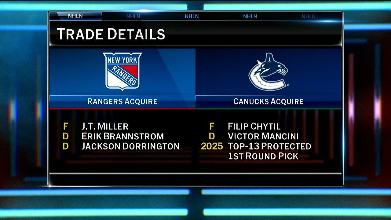 J.T. Miller was traded to the New York Rangers by the Vancouver Canucks on Friday for Filip Chytil, Victor Mancini, and a first-round pick in the 2025 NHL Draft.