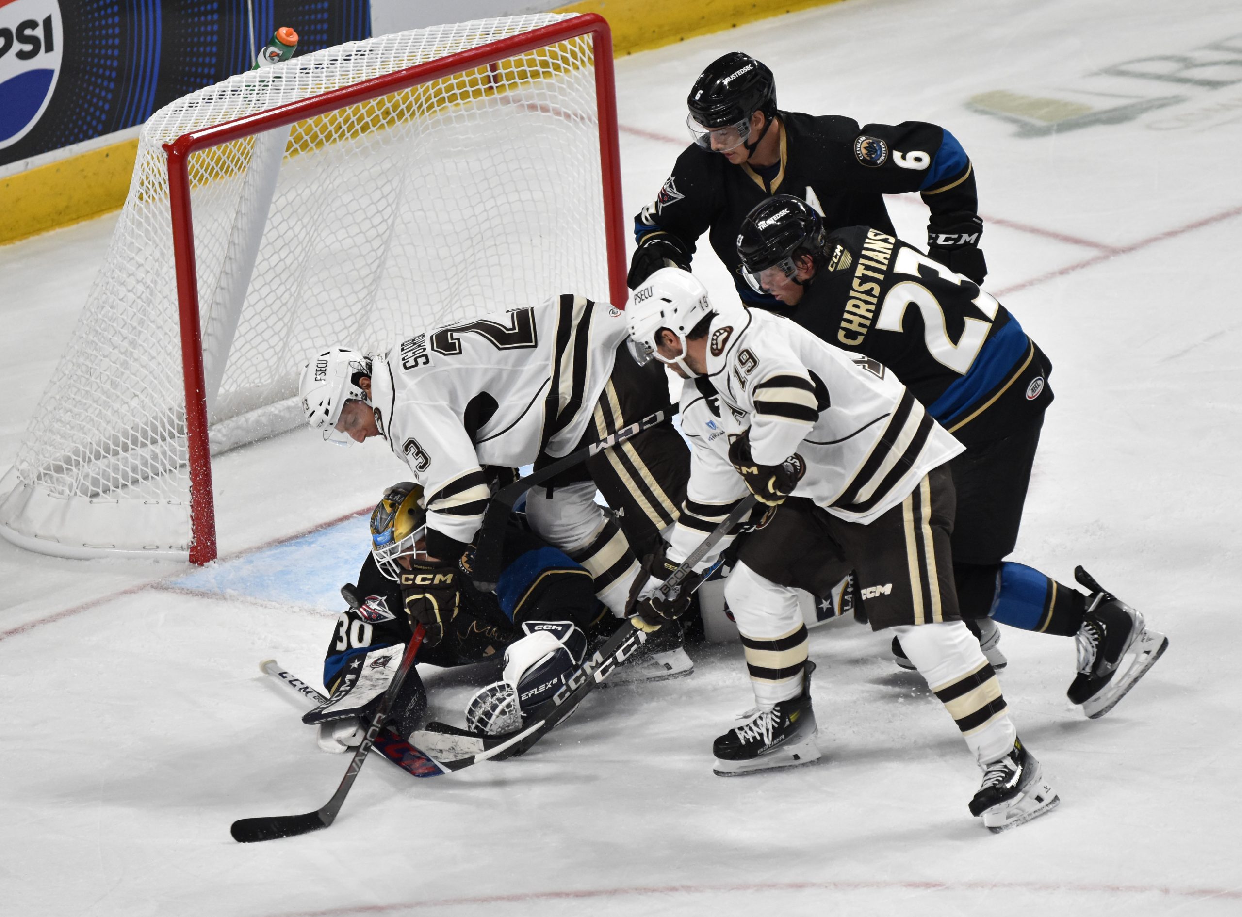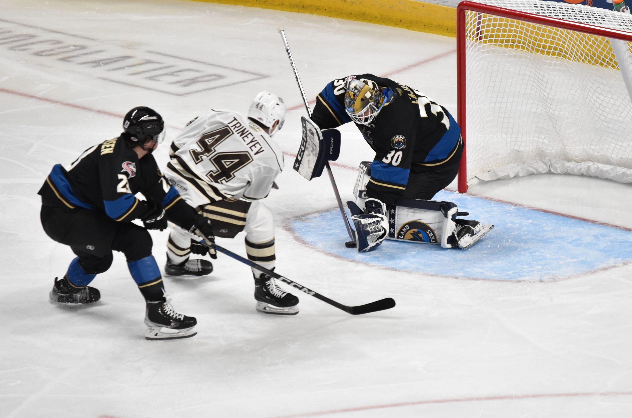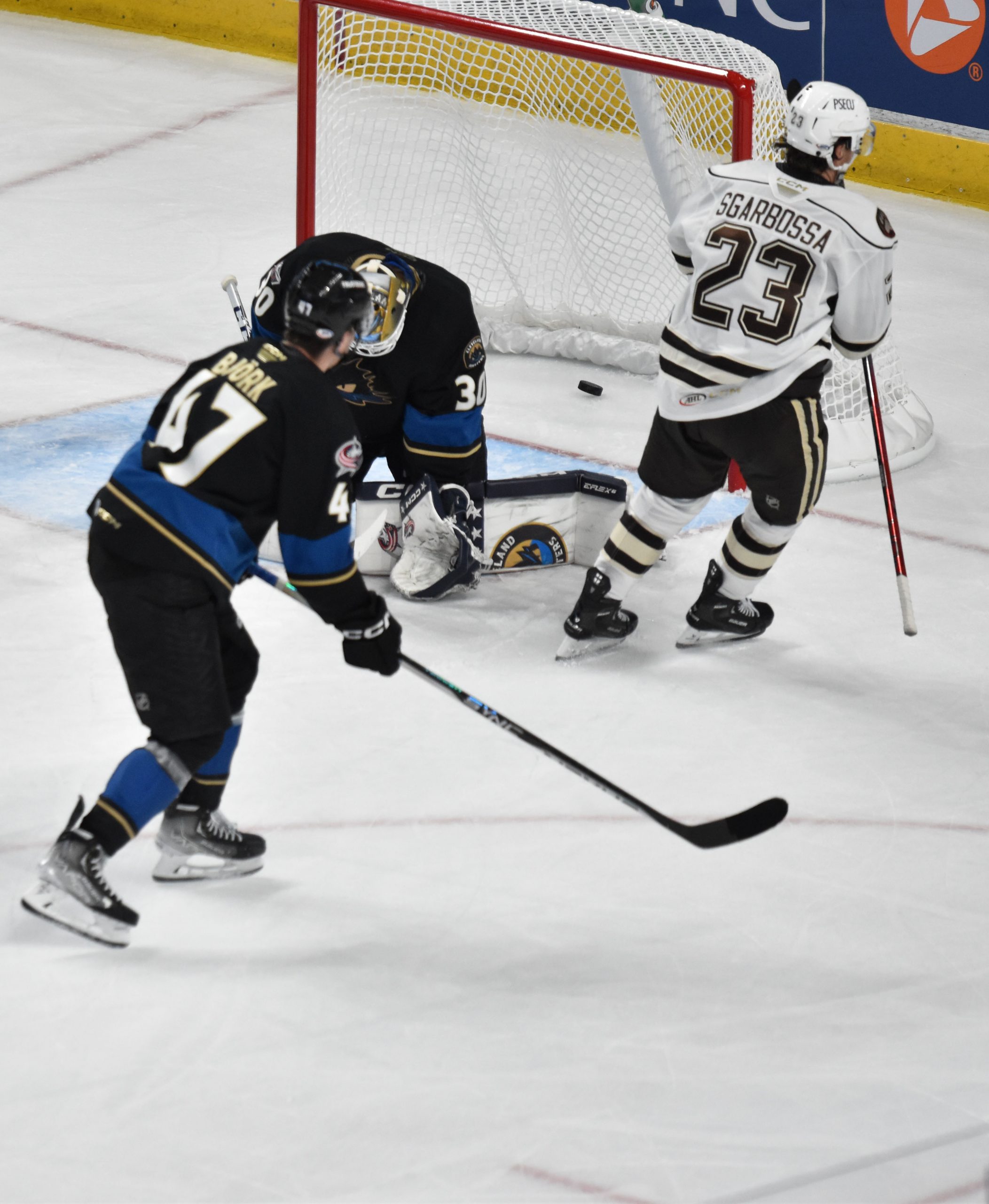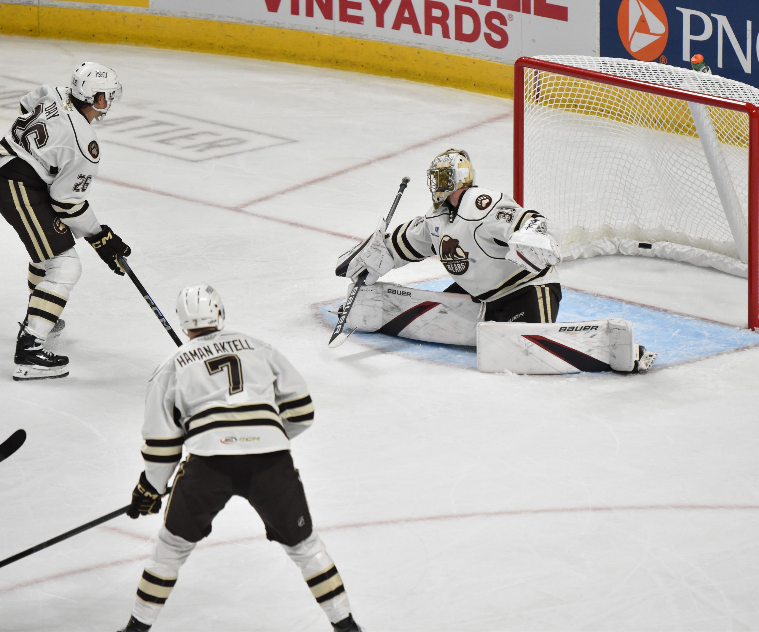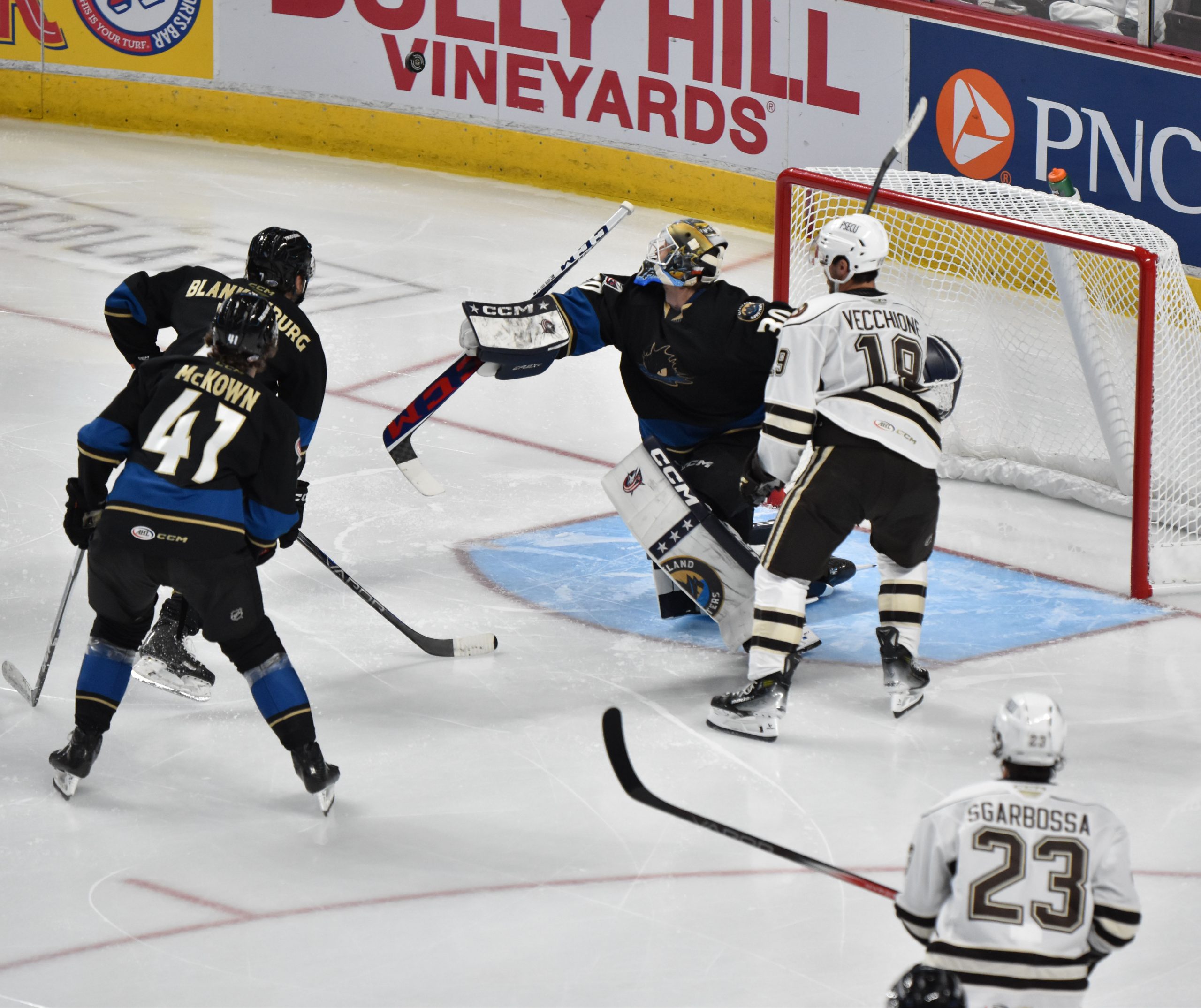 Cleveland’s Pavel Cajan made 22 saves in defeat while Hershey’s Clay Stevenson made 19 saves for the victory.