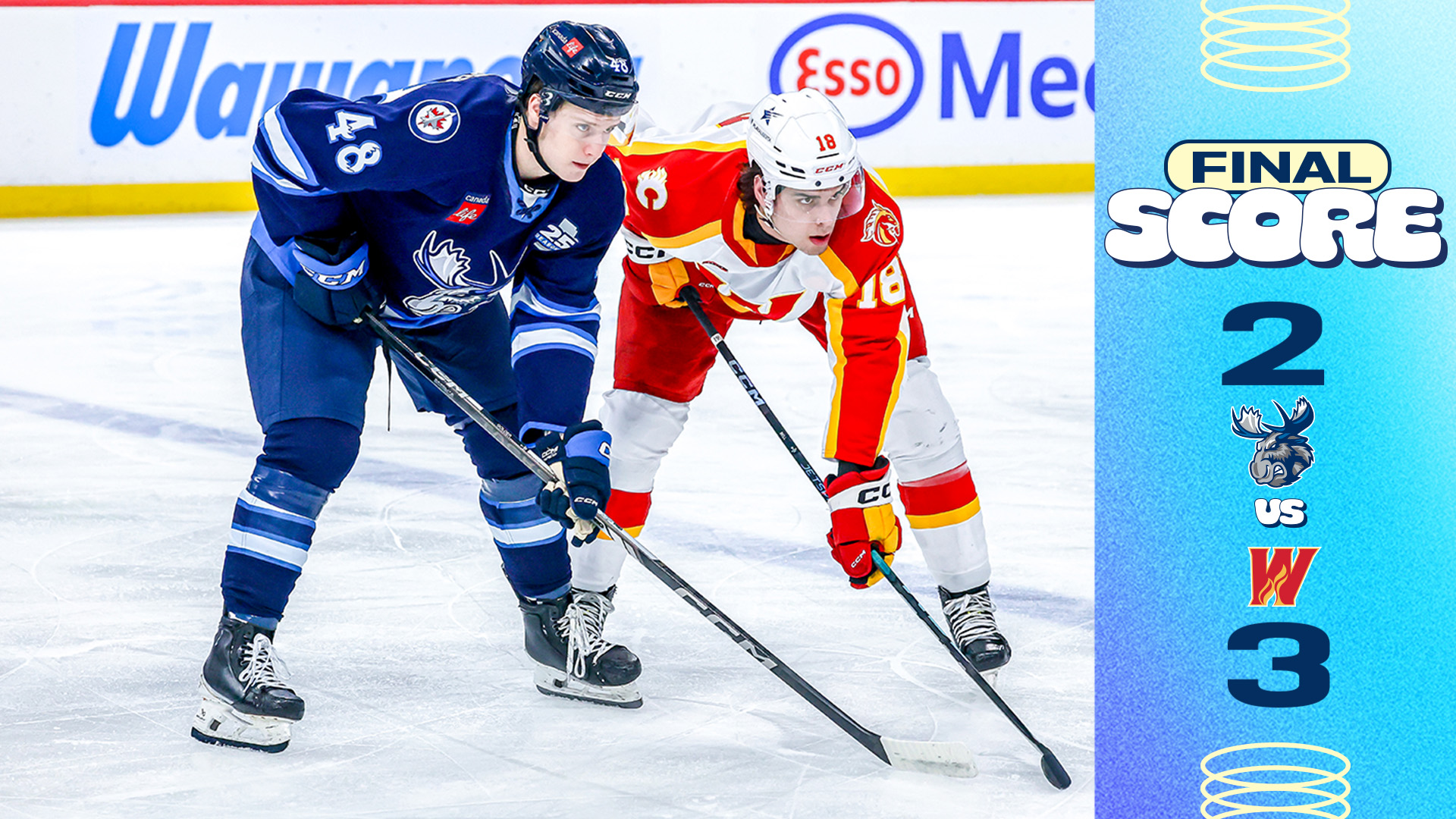 The Manitoba Moose (20-31-1-3) fell 3-2 to the Calgary Wranglers (31-20-4-2) on Sunday. The Moose were coming off a 6-5 win over Calgary on Saturday.