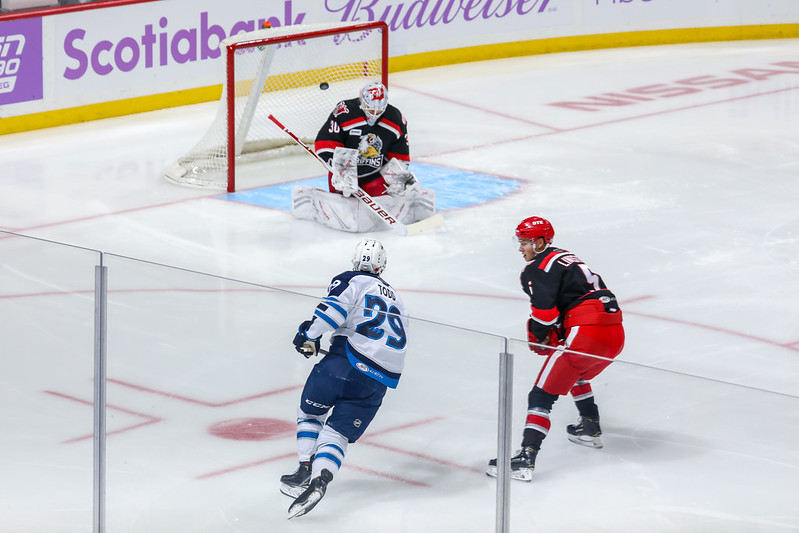 Less than 35 seconds into the first period, tensions boiled over from Saturday’s matchup as JC Lipon and Givani Smith dropped the gloves. Their exchange resulted in a game misconduct and both forwards were ejected. Seth Griffith scored the first goal of the afternoon on a give-and-go play from Andrei Chibisov making the score 1-0. Midway through the period, Cameron Schilling put away a slick pass from Leon Gawanke giving the Moose the 2-0 advantage. With just over two minutes remaining in the frame, the Griffins got within one on a goal from Ryan Kuffner.