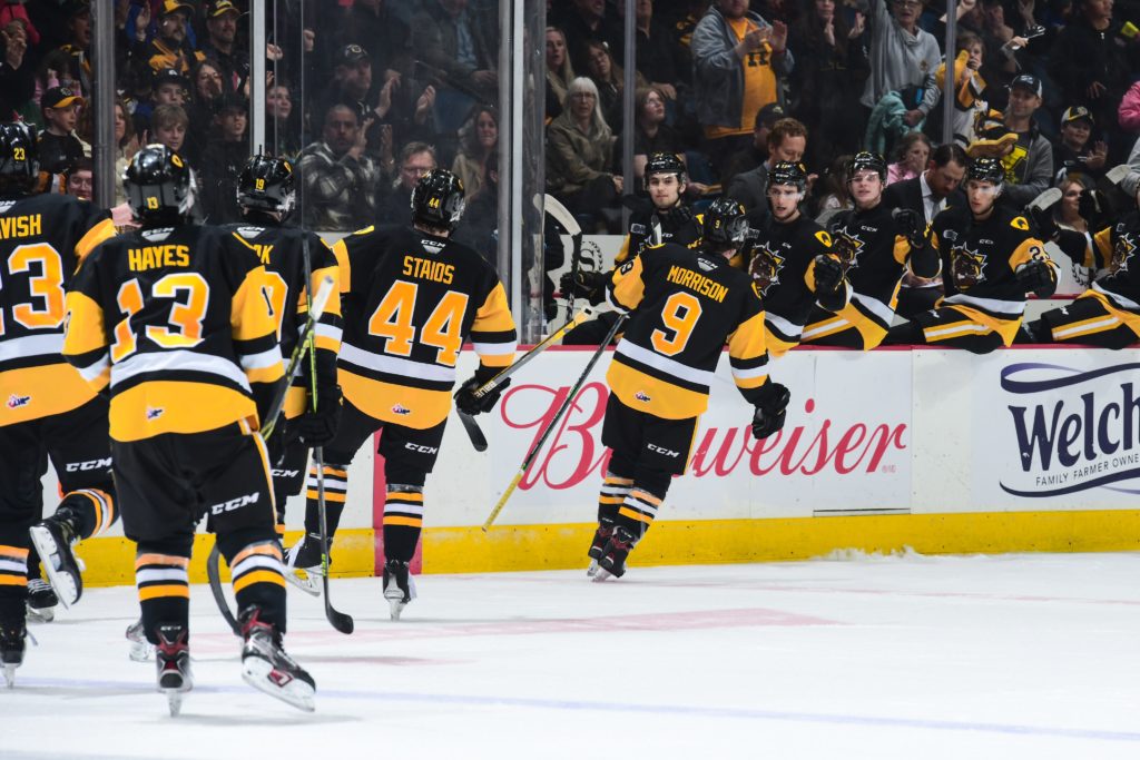 Tempers rose in the second period while the parade to the penalty box for both sides continued in a series that has quickly become an intense physical battle. Just passed the halfway point of the period while 4 on 4 Staios danced around the perimeter of the Petes end and sent the puck out for Morrison only to have Simpson stand tall once again. At 14:37 of the second period Avery Hayes strode onto a loose puck in neutral ice, creating a 2-on-1 with Gavin White who Hayes delivered the puck to and fired into an open side of the Petes goal putting the Bulldogs up 3-2 and giving the hosts their first lead of the game. Tensions continued to ratchet up to a boiling point following Avery Hayes having to temporarily leave the game following a high hit from Artem Guryev late in the 2nd. The Bulldogs appeared to feed off the incident as Logan Morrison struck for his 2nd of the game at 16:28 on the power-play as White’s point shot was stopped by Simpson and a rebound attempt from Ryan Winterton deflected to Morrison to fire into the empty goal. At the end of two periods of play the Bulldogs held a 4-2 lead and a 53-15 edge in shots on goal.