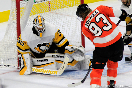 Right Wing Jakub Voracek (#93) of the Philadelphia Flyers shoots at Goalie Matt Murray (#30) of the Pittsburgh Penguins