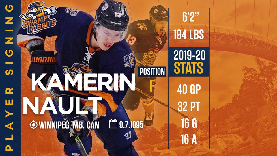 GREENVILLE, SC — The Greenville Swamp Rabbits announced today that third-year forward Kamerin Nault has re-signed with the team for the 2020-21 ECHL Season.