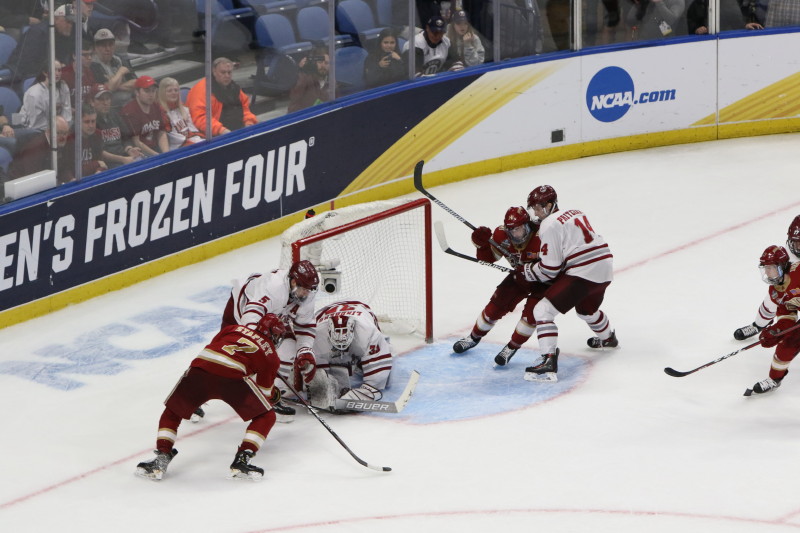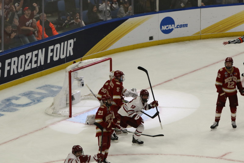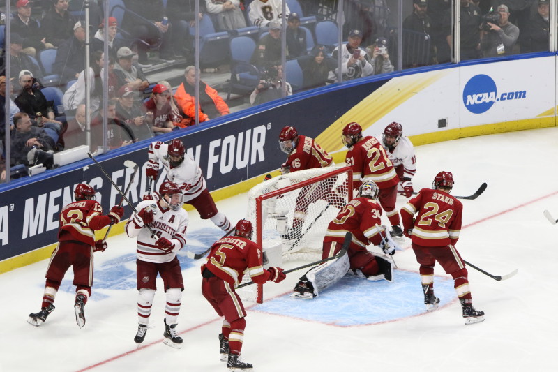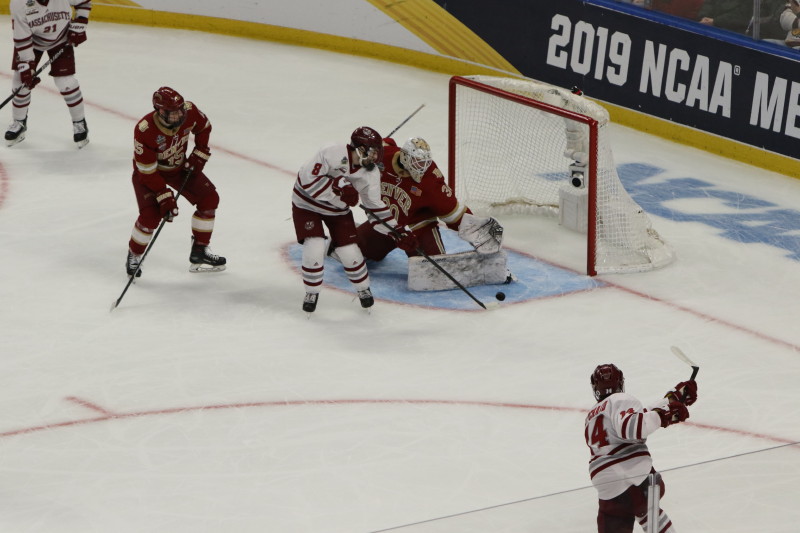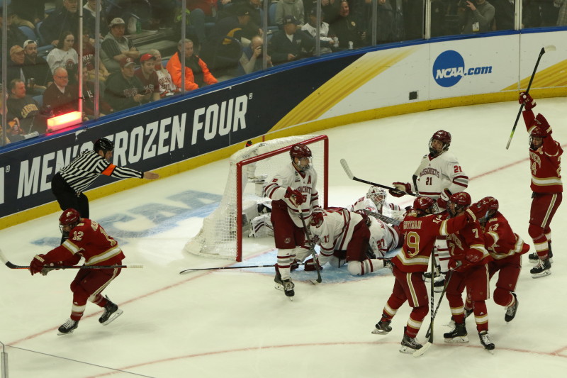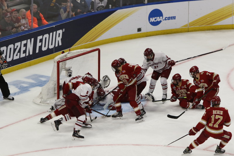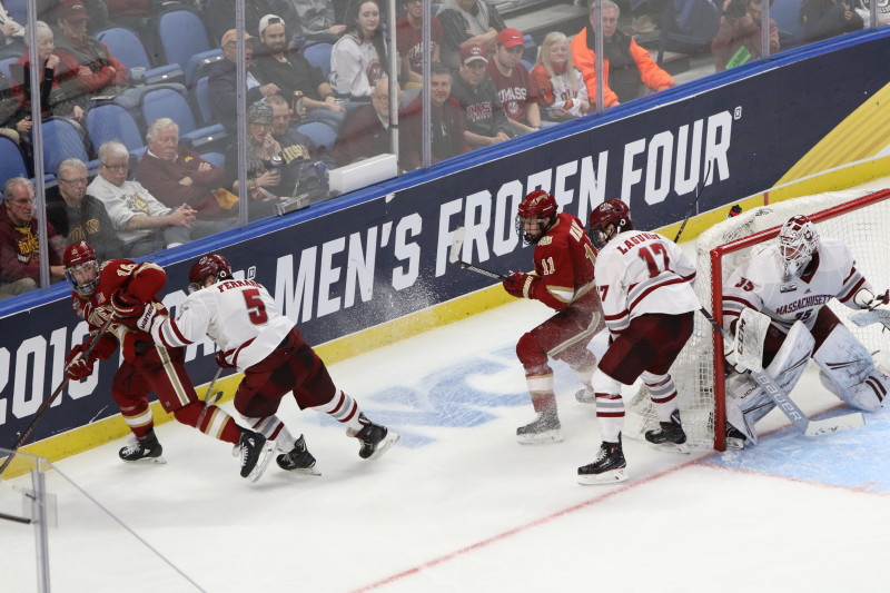 BUFFALO – The UMass Minutemen blew a two-goal lead in the third period, played without two forwards who were ejected, and still managed to find a way to win the second game of the semi-finals Friday morning on an overtime strike by Marc Del Gaizo.