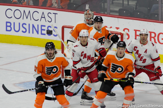 NHL 2022-OCT 29 CAR vs PHI Published October 29, 2022 at 525 × 350 in NHL 2022-OCT 29 CAR vs PHI Philadelphia Flyers and Carolina Hurricanes players look to the point for the shot.