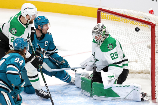 Logan Couture (39) watches Timo Meier’s shot, not pictured, elude Stars goalie Jake Oettinger to tie the score at 3-3 in the second period – Photo by Jack Lima
