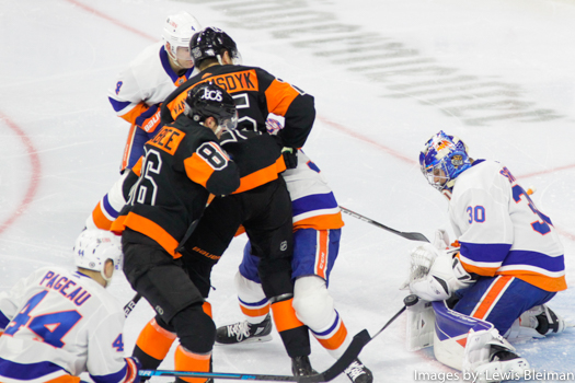 Philadelphia Flyers Joel Farabee #86 and James van Riemsdyk #25 battle with New York Islanders players as GoalieIlya Sorokin #30 makes a pad save.