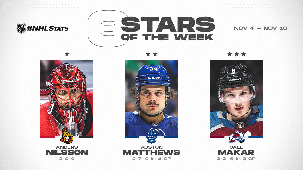 NEW YORK – Ottawa Senators goaltender Anders Nilsson, Toronto Maple Leafs center Auston Matthews and Colorado Avalanche defenseman Cale Makar have been named the NHL’s “Three Stars” for the week ending Nov. 10.