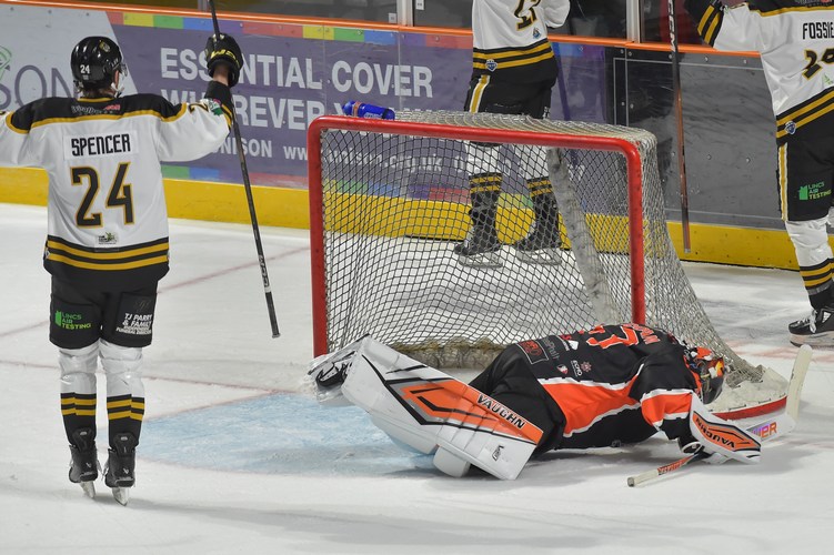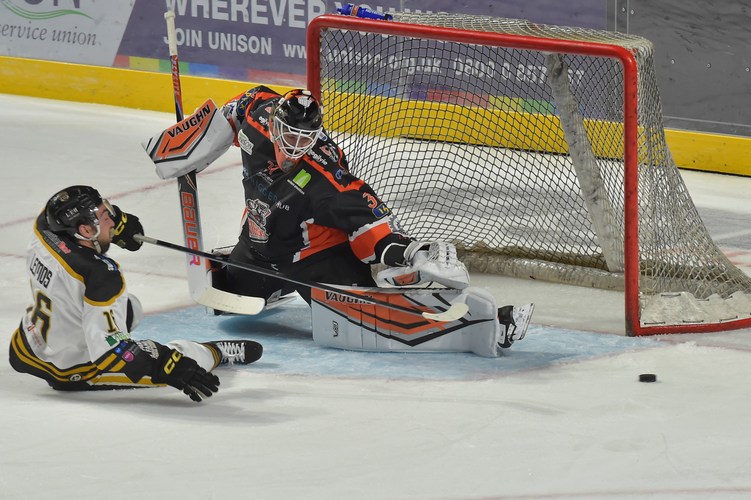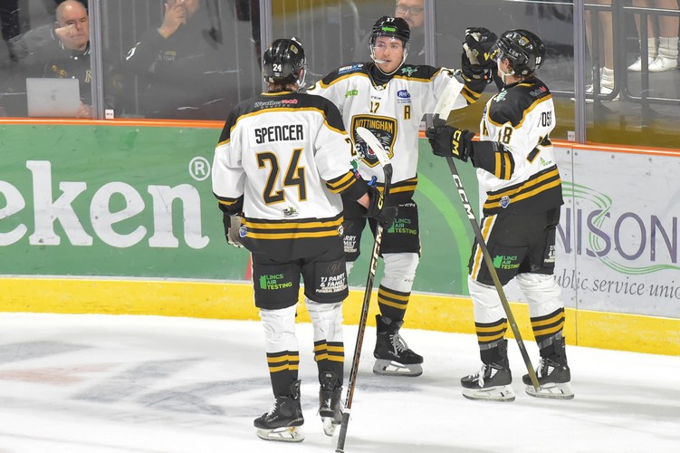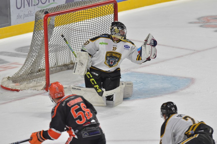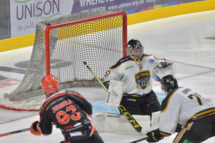 The hosts eventually opened the scoring on a rare odd-man rush against the run of play. Evan Jasper fed Robert Dowd for a neat back-door finish just past the 15-minute mark. From the resulting faceoff, a collision between two Panthers defencemen left Cole Shudra through on Kevin Carr, but the Nottingham netminder stood tall with a blocker save.