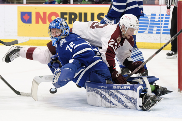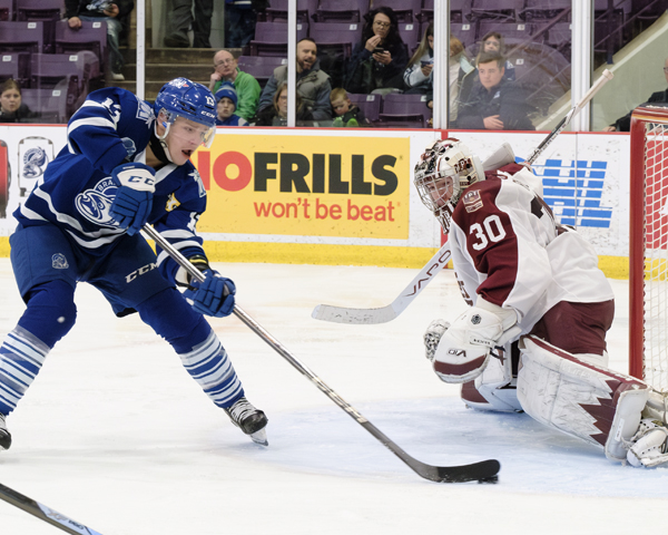 Peterborough continued to pressure when Martin Matejicek ripped a shot on net, but it rang off the crossbar. Colin Fitzgerald picked up the rebound, driving to the net before having the puck knocked off his stick. Genc Ula found the loose puck, jamming a shot on goal, but Jack Ivankovic sprawled over to make the save.