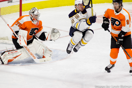 Victor Olofsson #68 of the Buffalo Sabres jumps to screen Philadelphia Flyers Goalie Carter Hart #79 as the puck is stopped by the skate of Ivan Provorov #9 of the Philadelphia Flyers