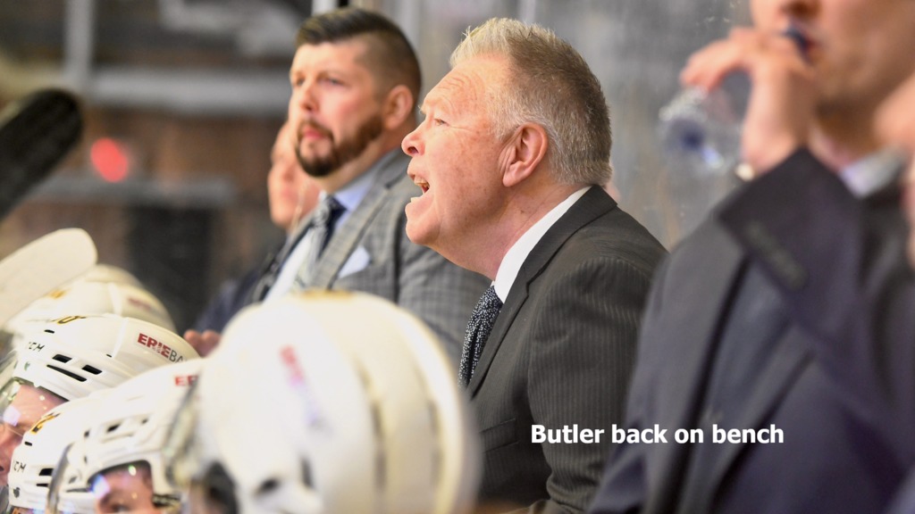 Butler took to the visiting bench with the Erie Otters, who were paced by Carey Terrance’s two goals and Alexis Daviault’s goal and two assists in skating to a 5-3 verdict before a crowd of 2,395.
