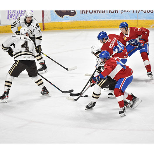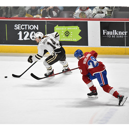 At 10:15 of the first period, Cody Franson scored for a second consecutive game to give Hershey an early lead. On the power play, a shot from the center point beat Laval goaltender Cayden Primeau low to the ice. The Rocket answered at 17:00 on Terrance Amorosa’s first goal of the season. Shots after 20 minutes were even at 10-10 with the score knotted at 1-1.