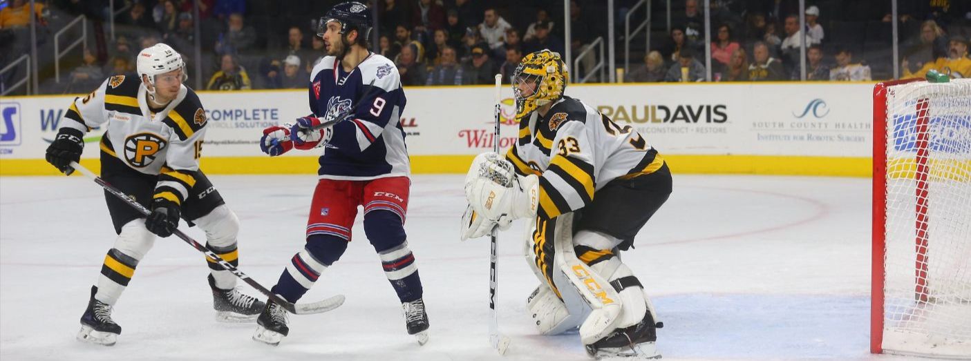 After Robert Lantosi had increased a Providence lead to 3-1 with a goal at 16:55 of the third, both Phil DiGiuseppe and Danny O’Regan scored for the Wolf Pack with goaltender Igor Shesterkin (34 saves) pulled for an extra attacker.