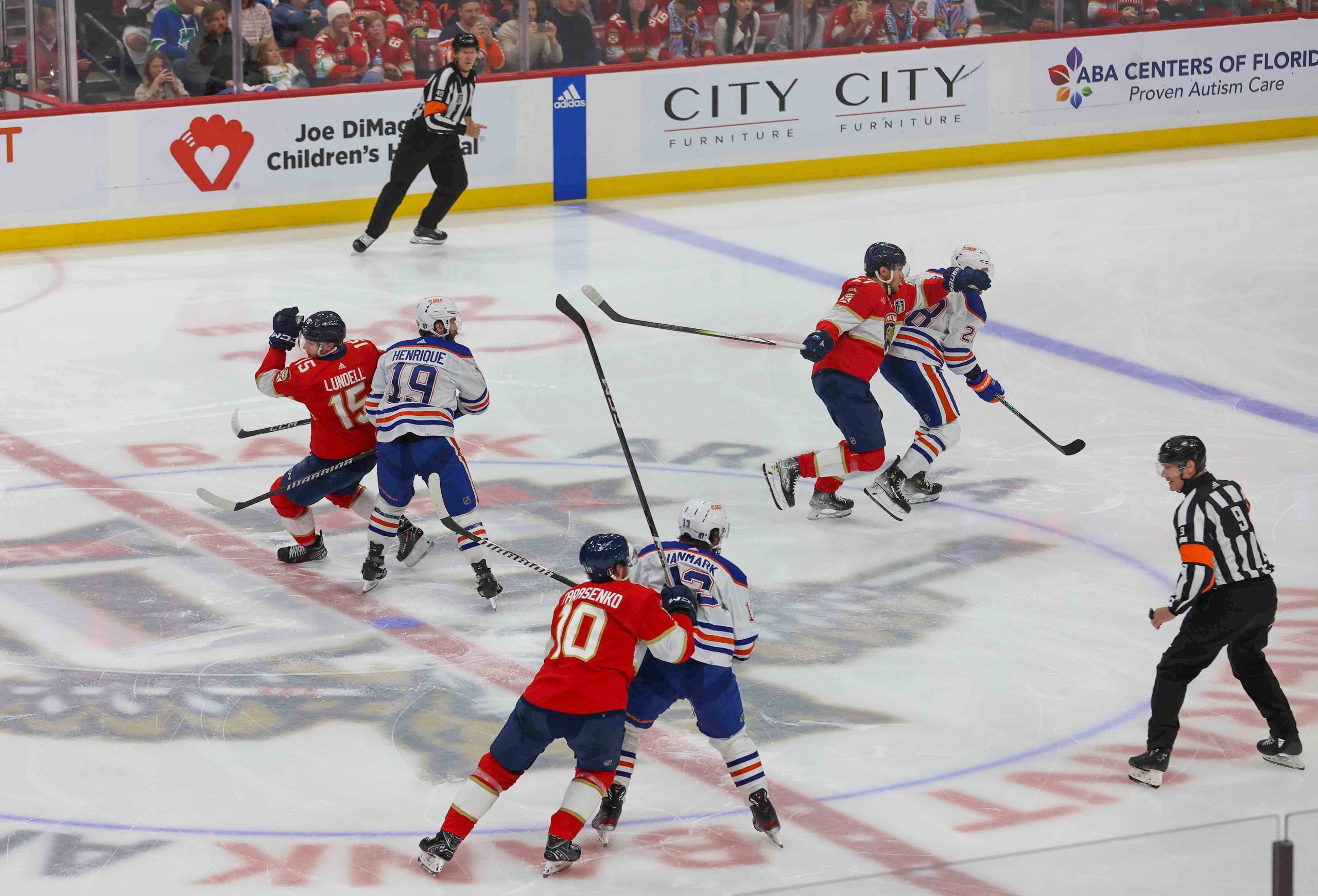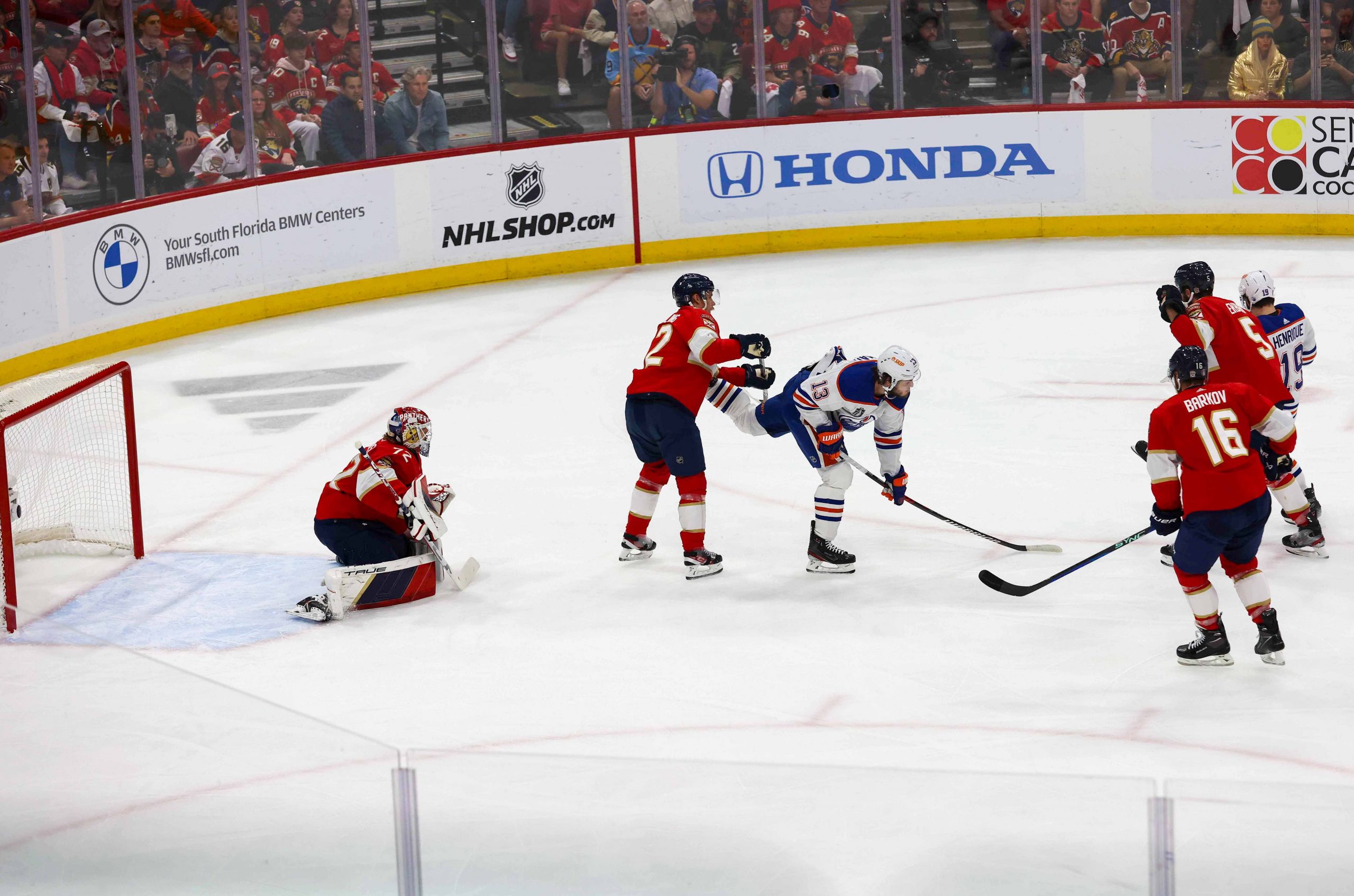 Edmonton’s Warren Foegele was called for high-sticking Florida’s Brandon Montour. The Panthers sought to penetrate the Edmonton goal, something which had not been successful in the first six games of the series.