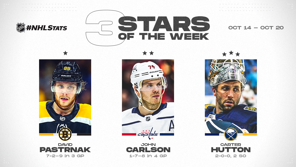 NEW YORK – Boston Bruins right wing David Pastrnak, Washington Capitals defenseman John Carlson and Buffalo Sabres goaltender Carter Hutton have been named the NHL’s “Three Stars” for the week ending Oct. 20.