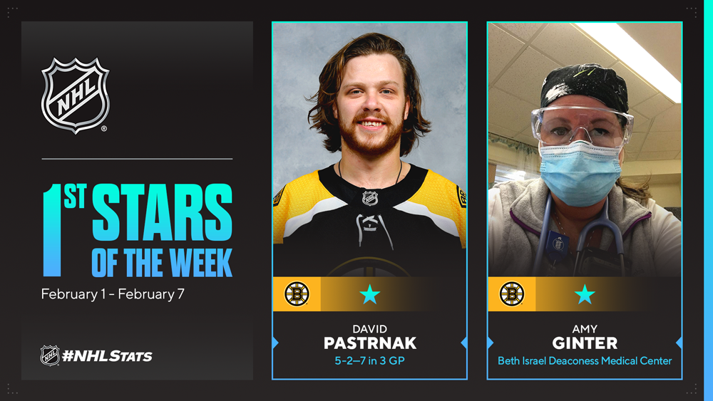 NEW YORK – Boston Bruins right wing David Pastrnak and Beth Israel Deaconess Medical Center (BIDMC) respiratory therapist Amy Ginter have been named the NHL’s “First Stars” for the week ending Feb. 7.