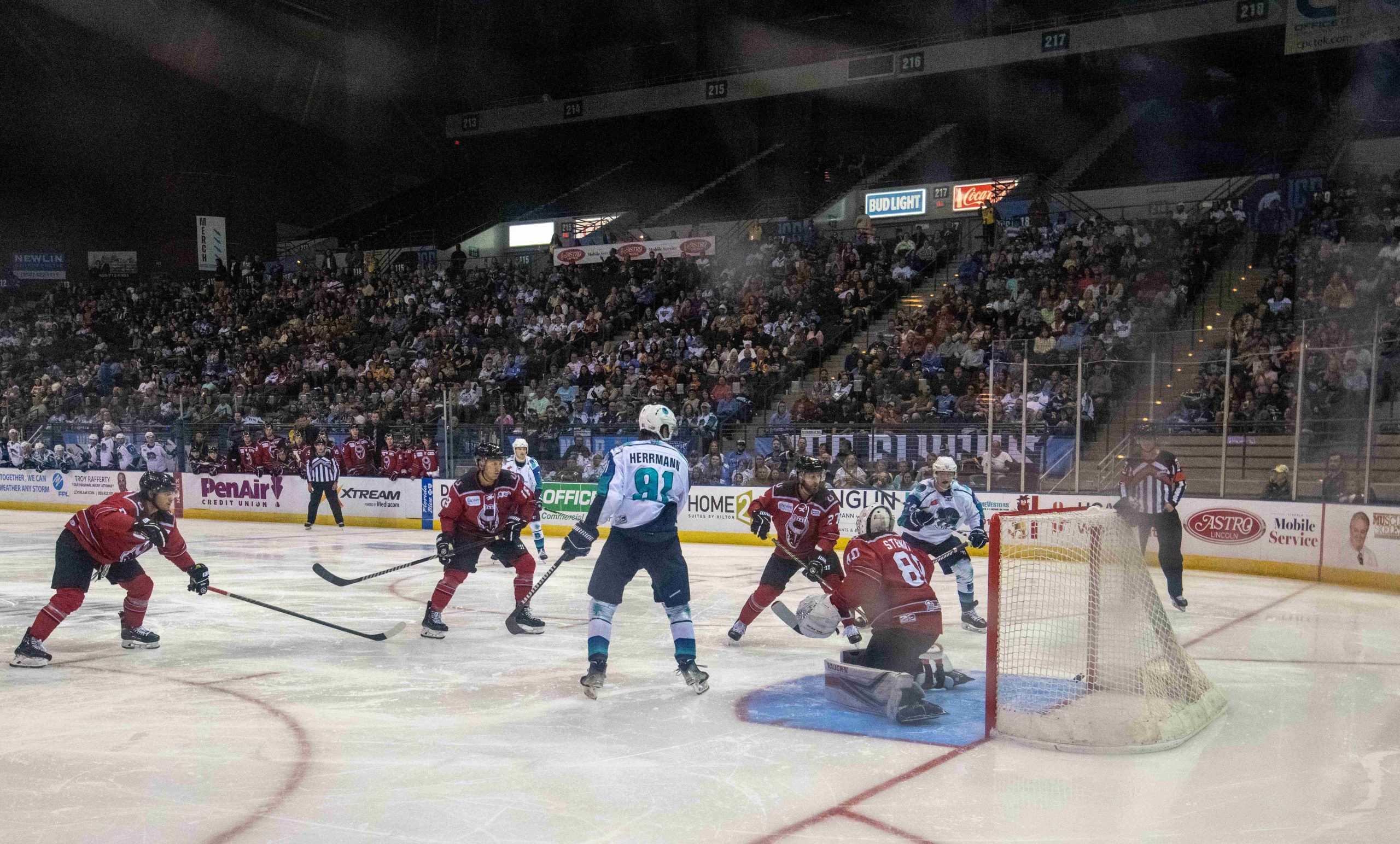 Netting 7 goals in 34 shots, the Ice Flyers were effective in setting up plays and delivering the puck to targets in the crease as well as impressive shooting from the outside. Immediately gaining the momentum with a goal 1:21 into the contest, the Bulls were looking formidable until a disallowed Ice Flyers goal 8 minutes into the game turned the momentum. Fans erupted in protest, and the din from the crowd fueled a turnaround that would last the entire game. From the hat trick by Brett Mercones to Mitch Atkins’ streamlined pass to Sean Gulka waiting to tap in at the net, the night turned truly next level for Pensacola.