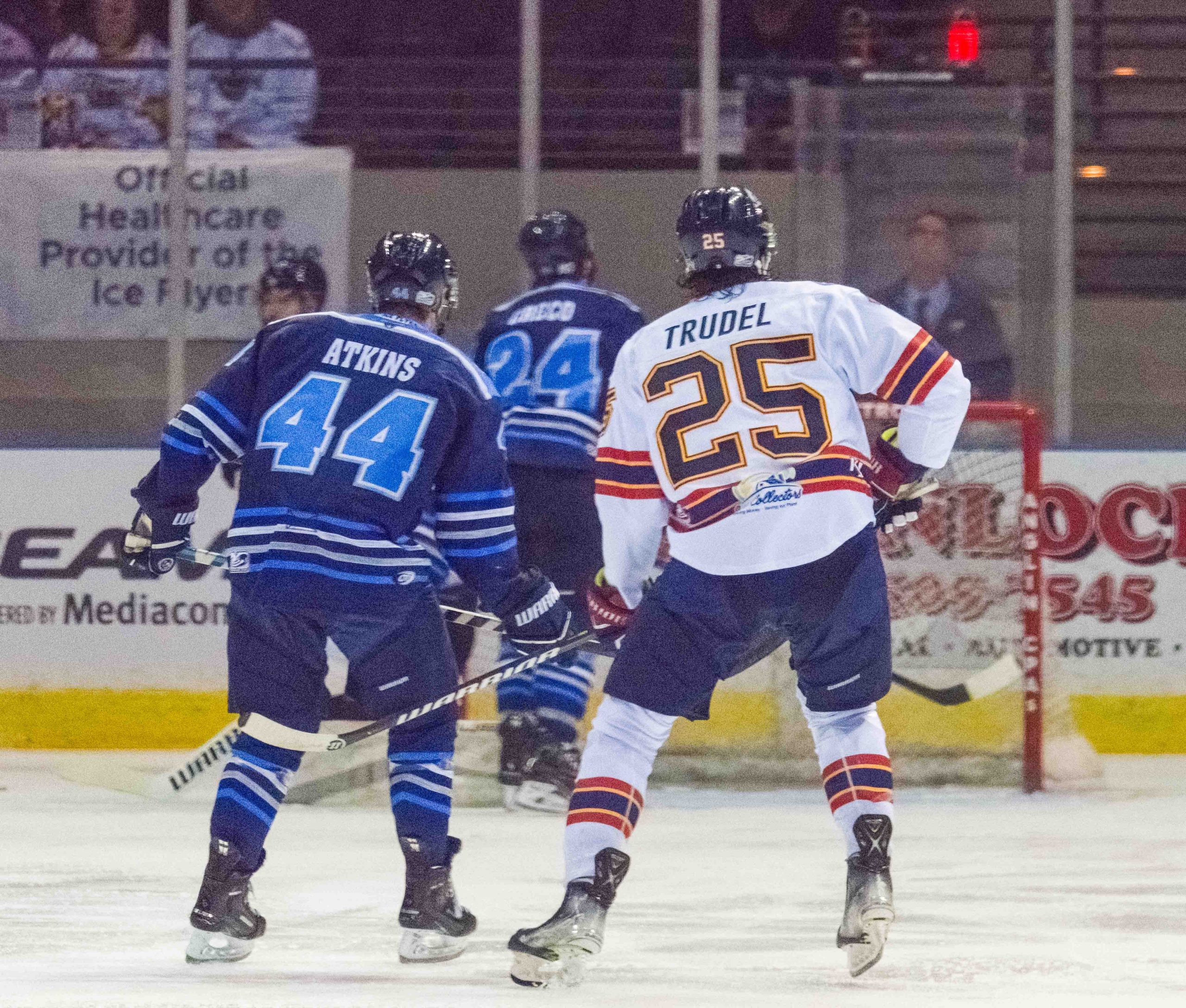 A crowd of 3,609 in the Ice Flyers fourth home game in 12 days watched the Ice Flyers get stymied without a goal in the first two periods. That changed when Mitch Atkins scored 18 seconds into the third period when getting a loose puck, making a quick move, and firing into a wide-open net.