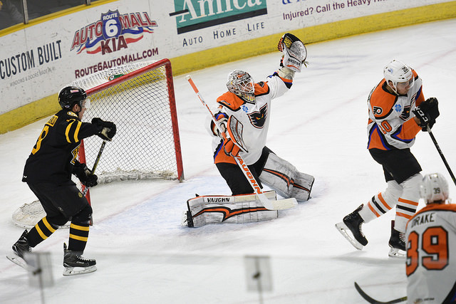 Rookie Zach Senyshyn (10th) struck on a breakaway that was initially poke-checked away by John Muse but the first-round talent was able to retrieve the puck far to the right of the cage and convert from a sharp-angle just 34 seconds into the third period cutting the Phantoms’ lead to 5-2.