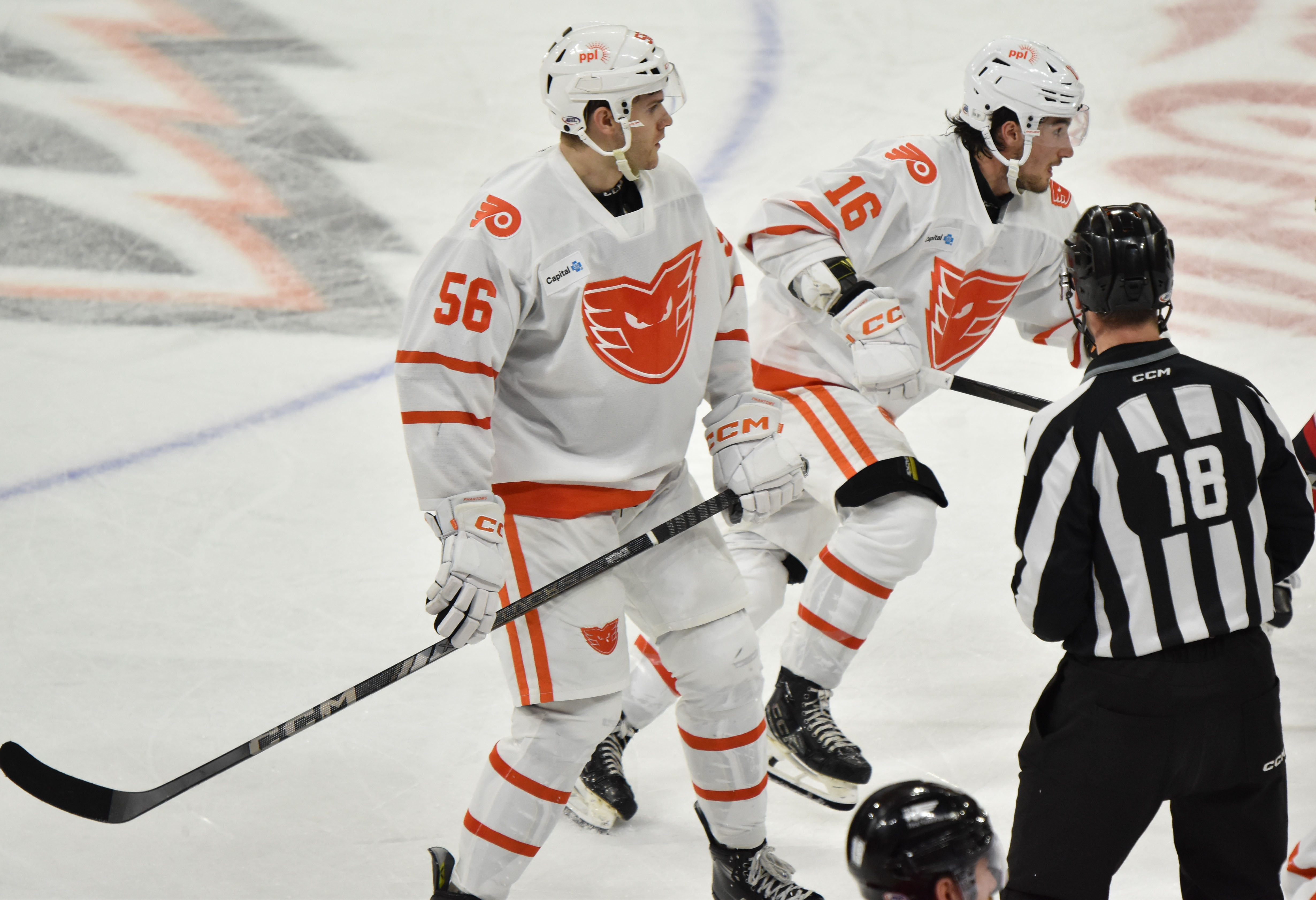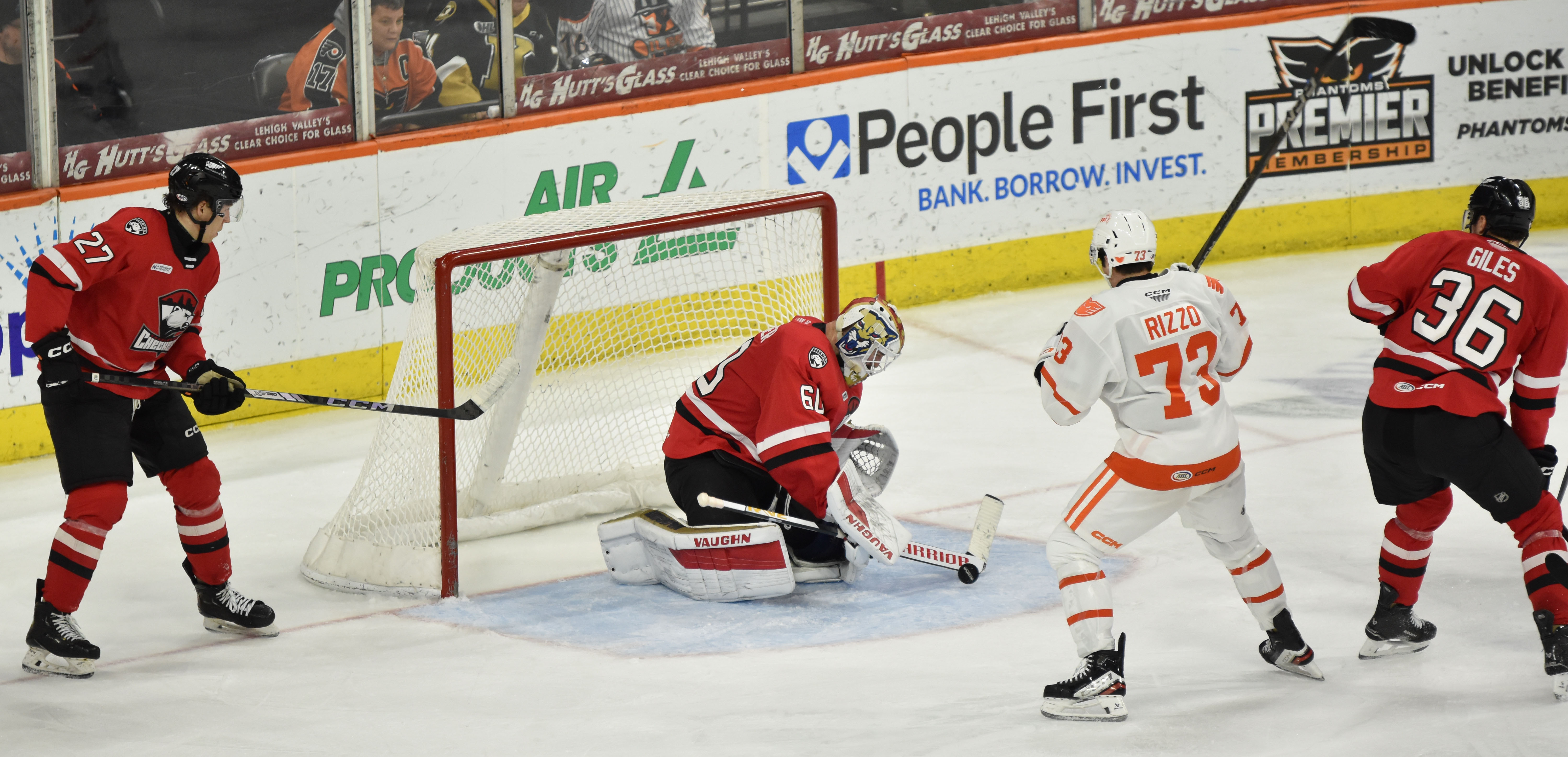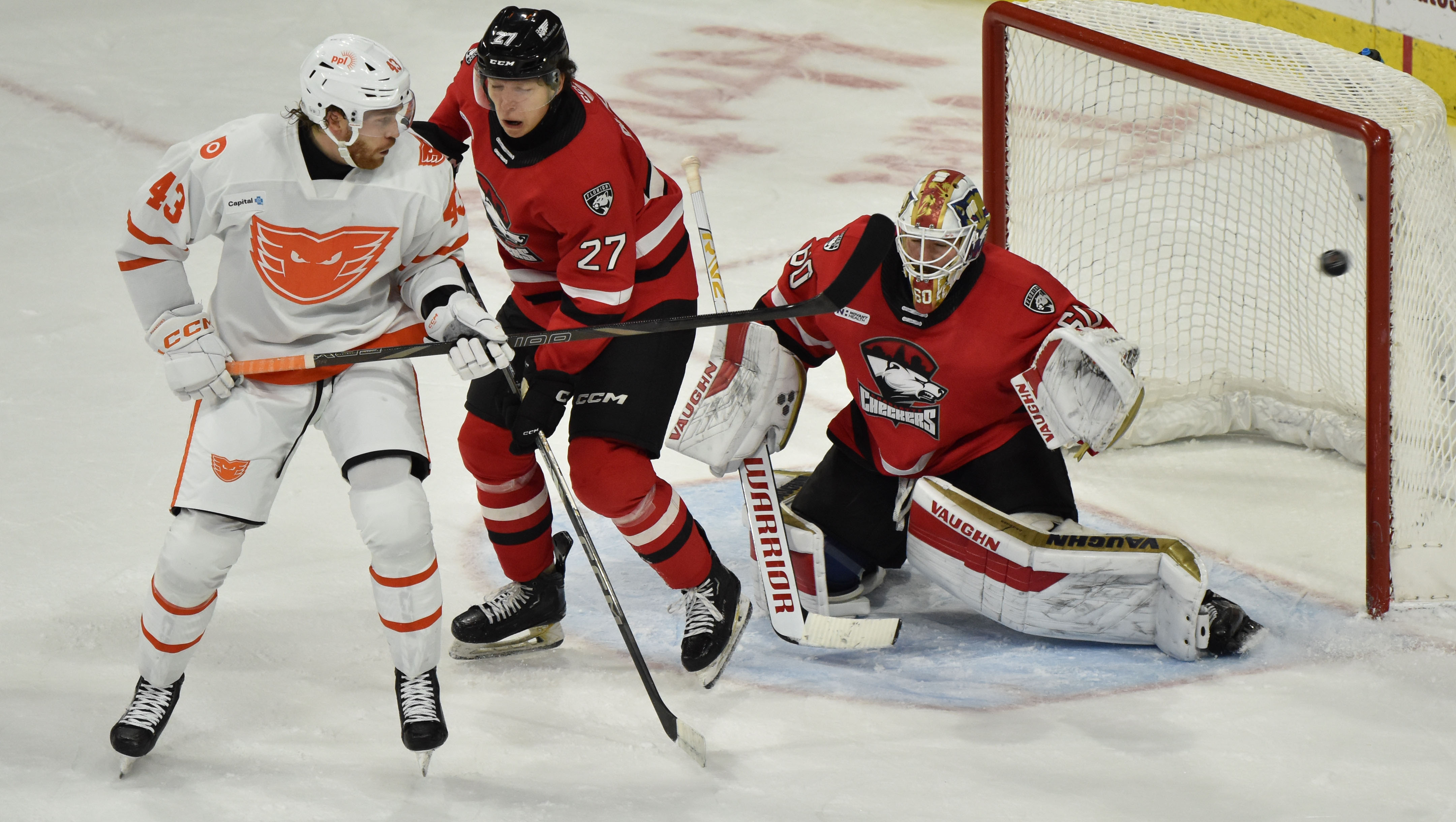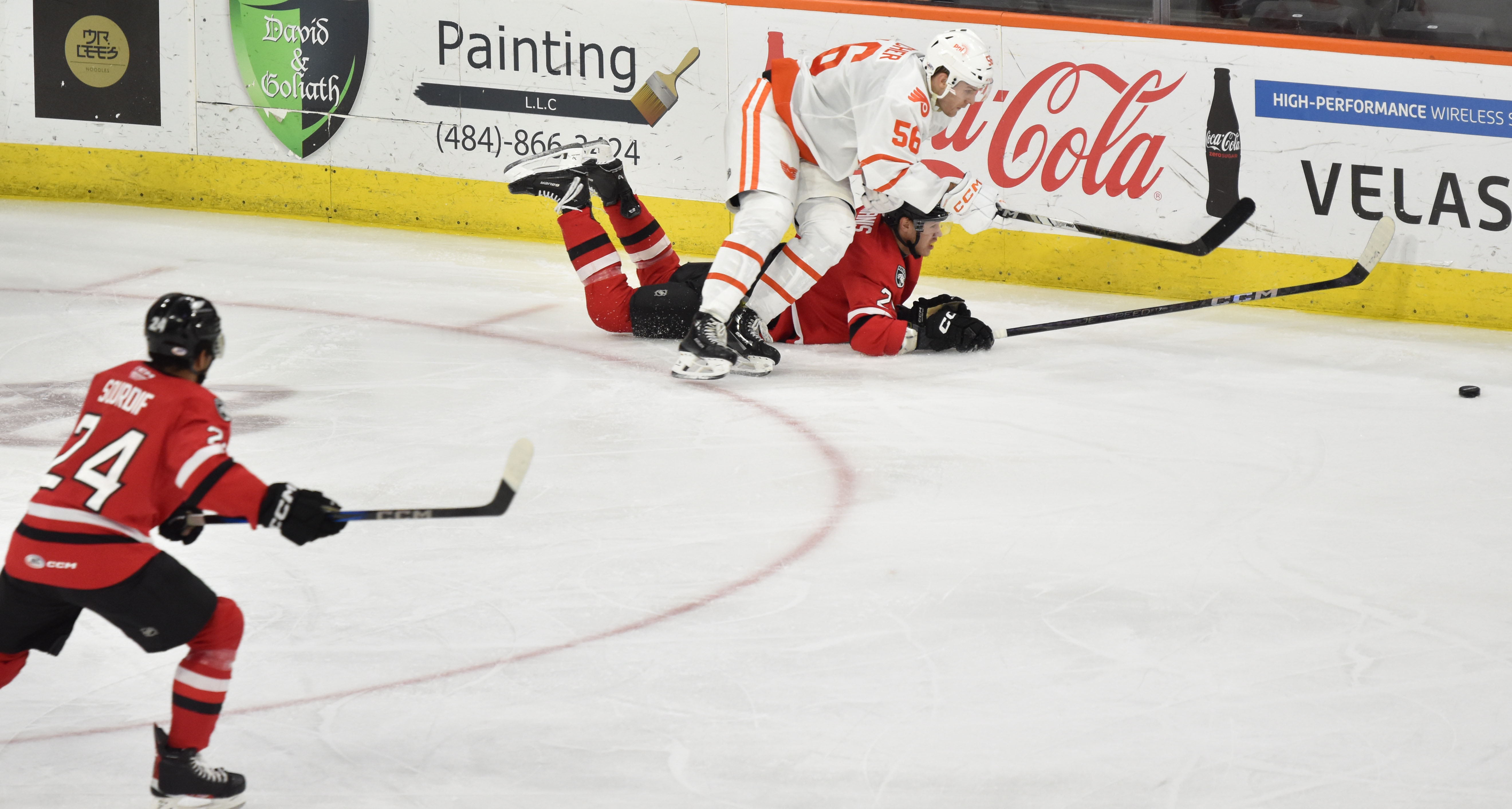 But the Phantoms couldn’t find the equalizer and Charlotte put together two more goals down the feisty stretch to finish the win. Riley Hughes (1st) scored out in front after Cal Petersen scrambled to his left for a strong save on the back-door. And Oliver Okular (10th) tucked in his power-play marker a few minutes later from the right of the cage to seal the deal.