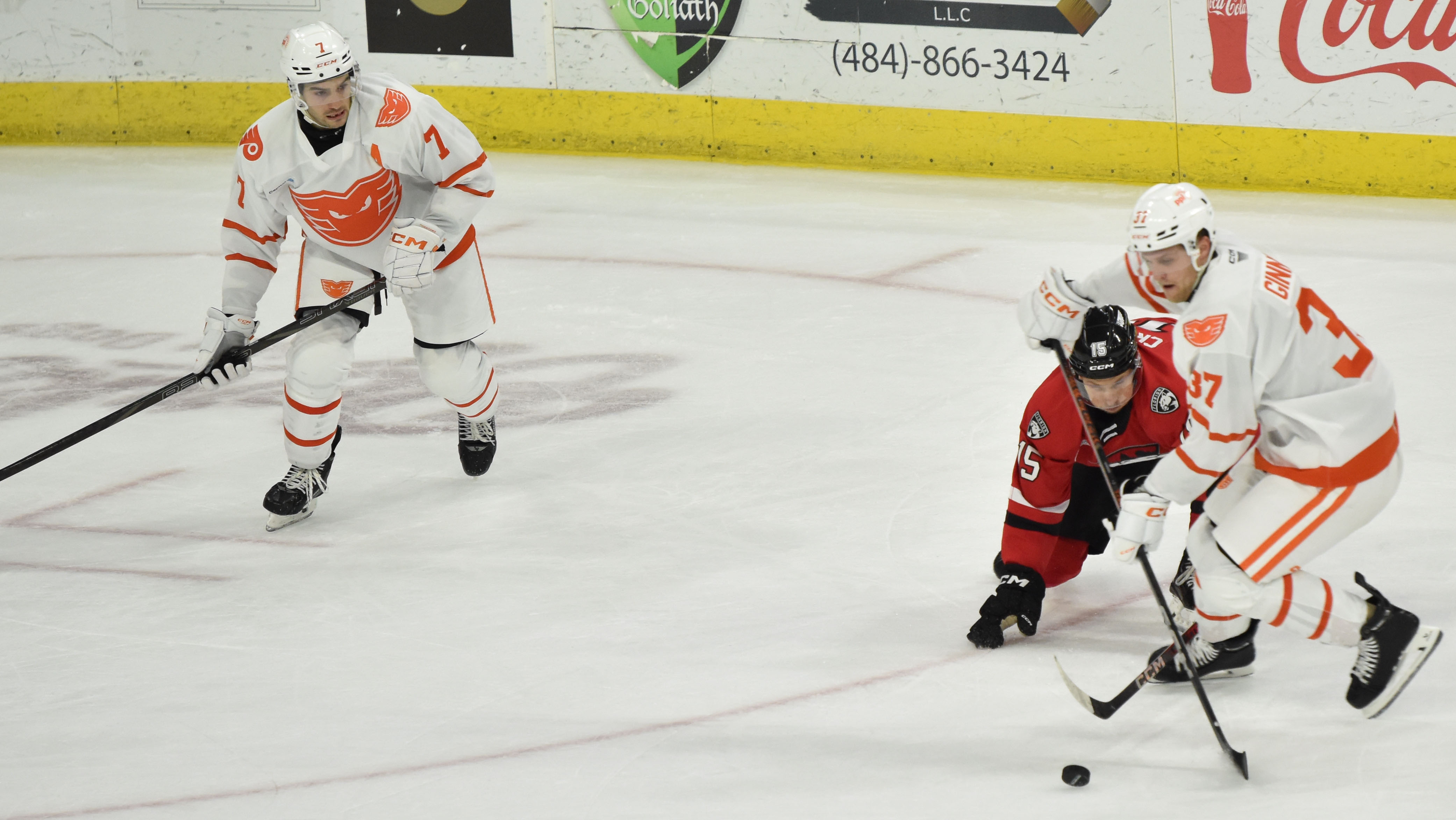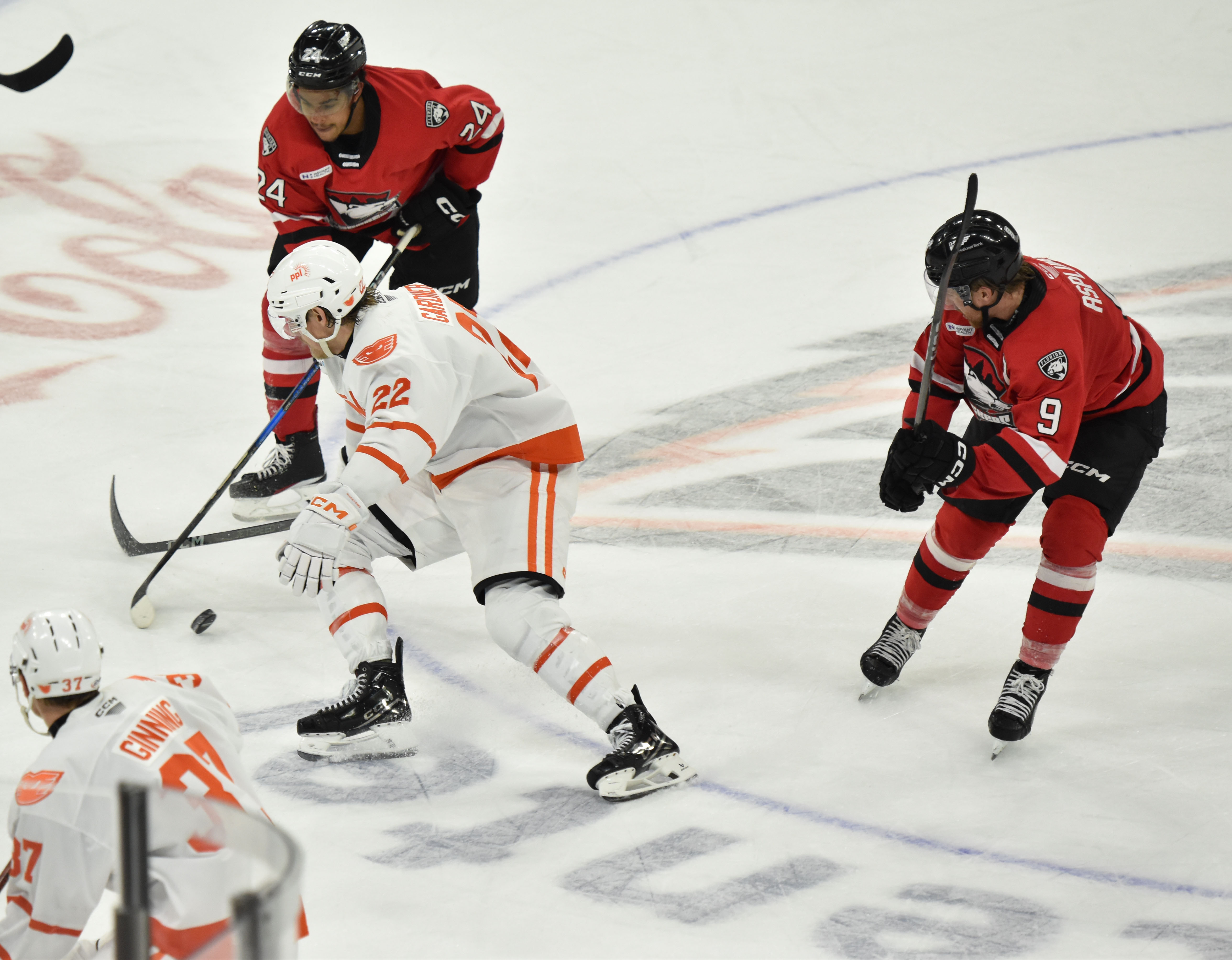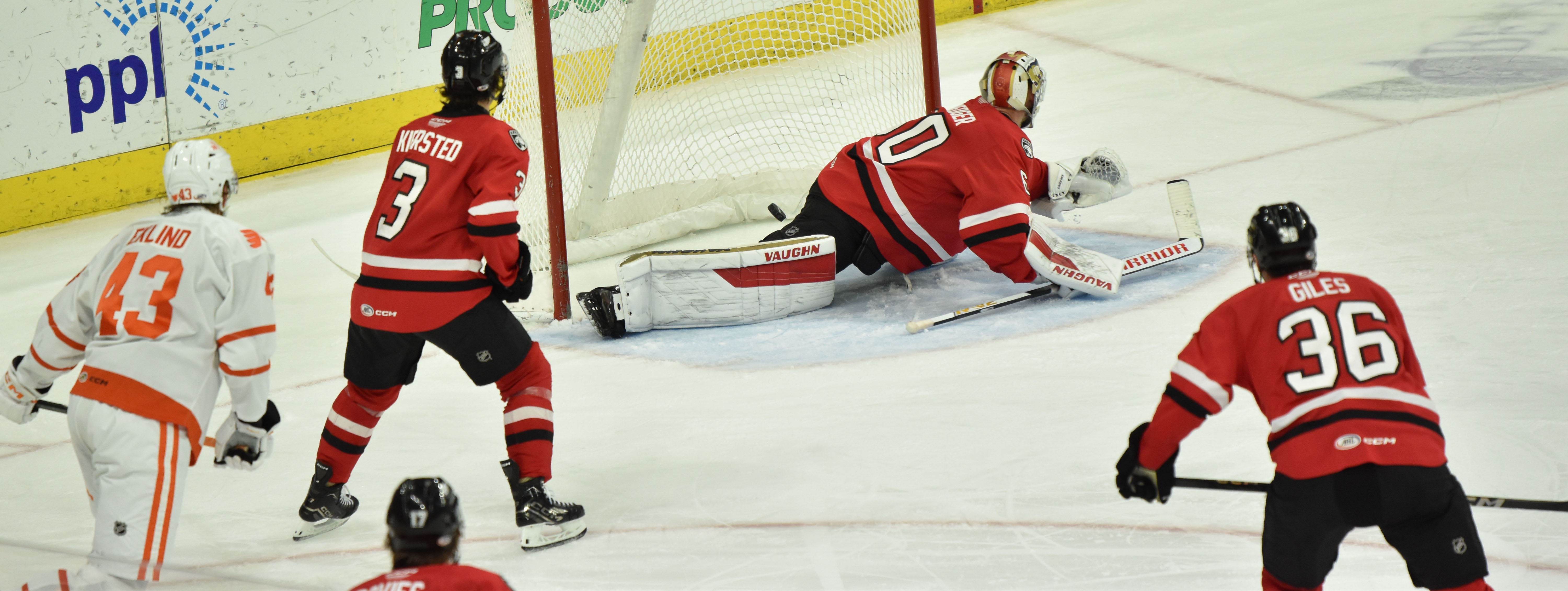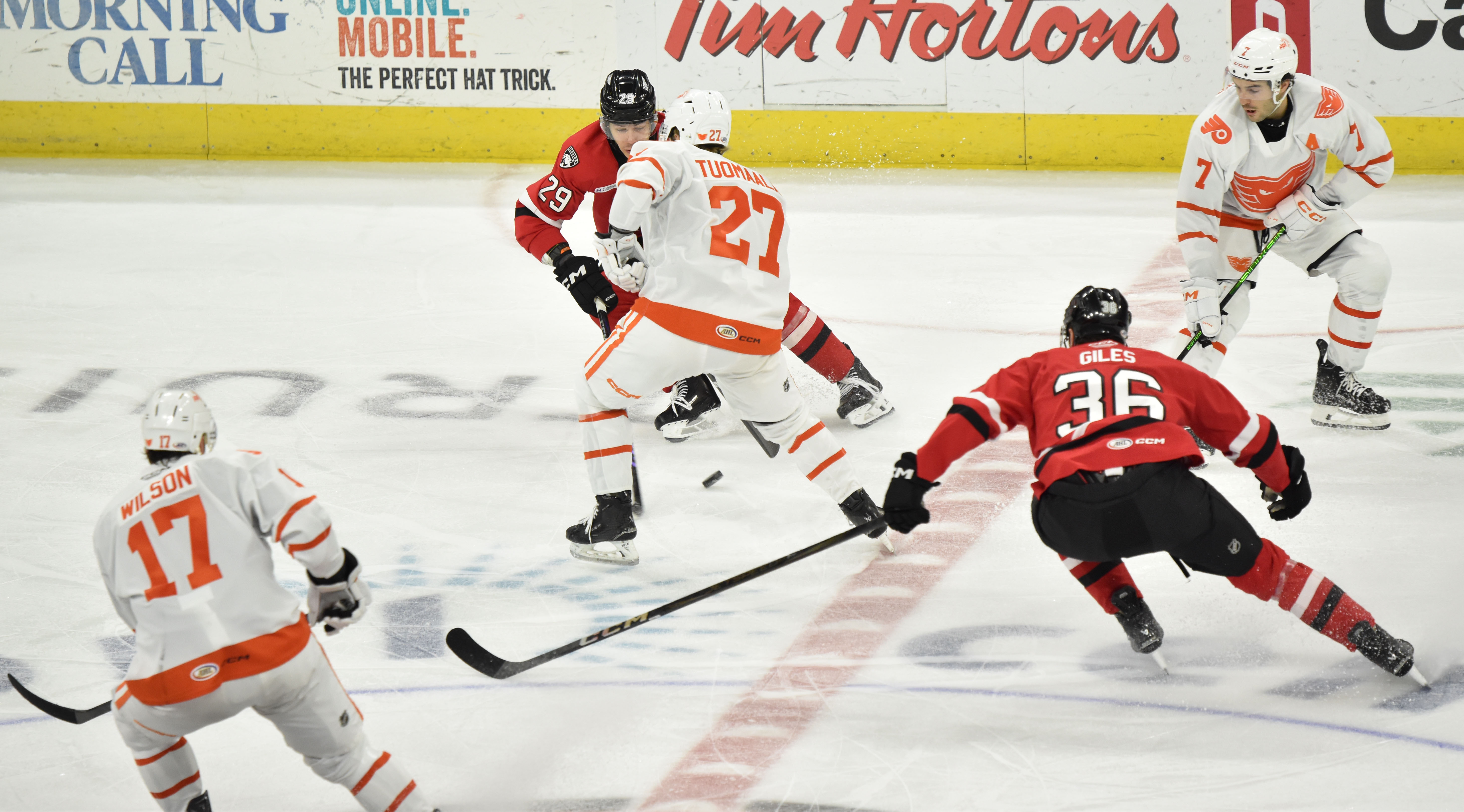 But the Phantoms couldn’t find the equalizer and Charlotte put together two more goals down the feisty stretch to finish the win. Riley Hughes (1st) scored out in front after Cal Petersen scrambled to his left for a strong save on the back-door. And Oliver Okular (10th) tucked in his power-play marker a few minutes later from the right of the cage to seal the deal.