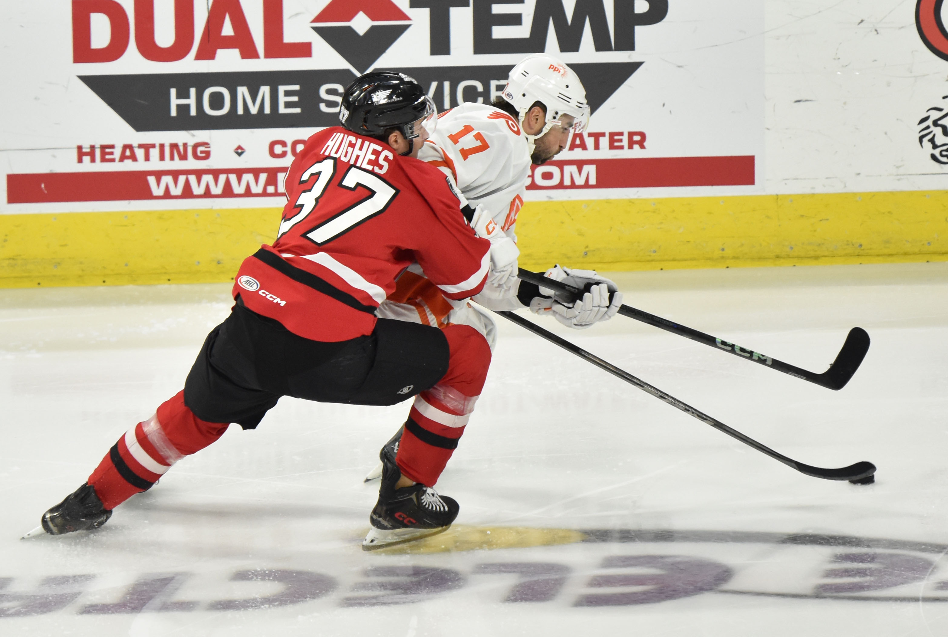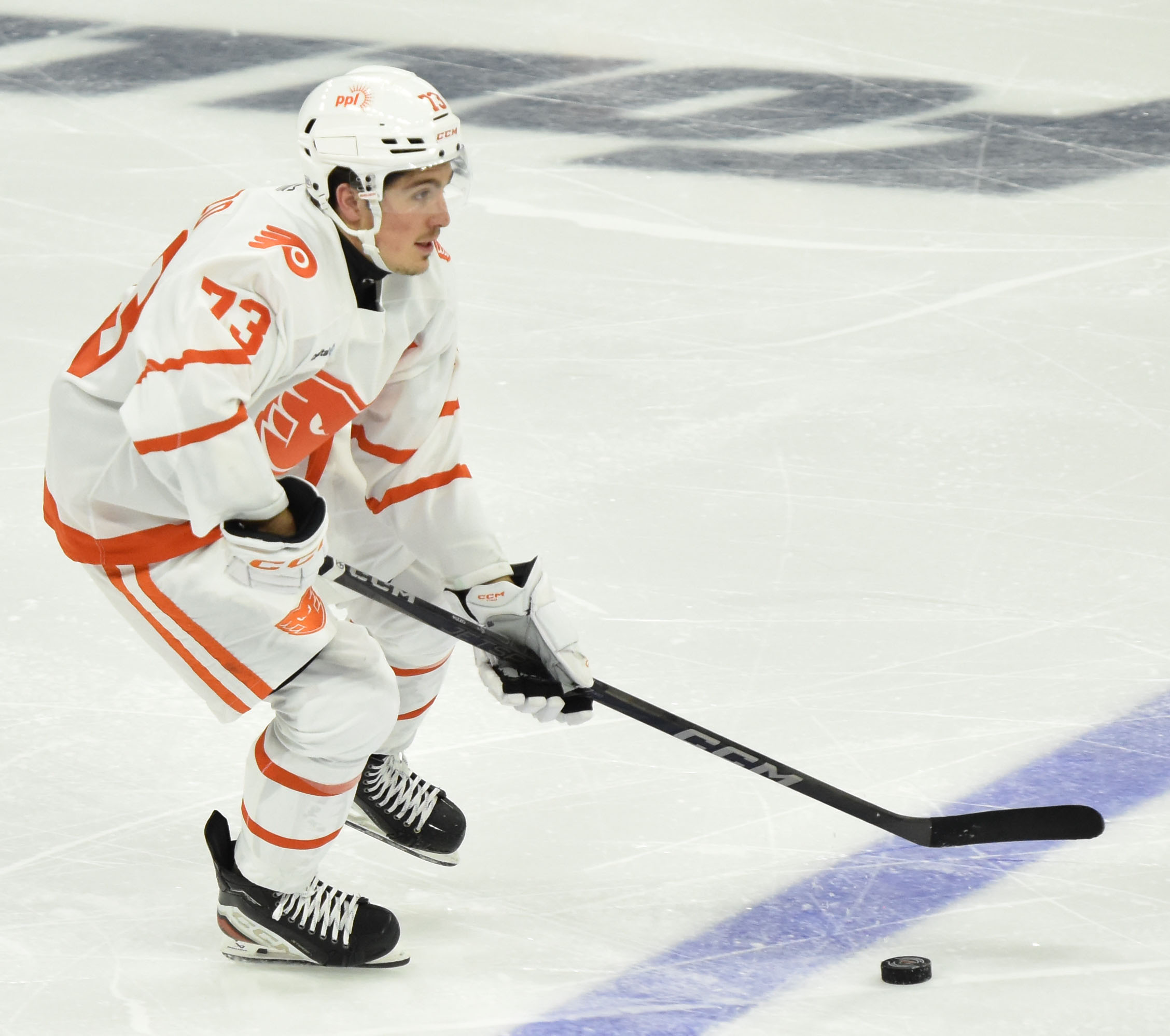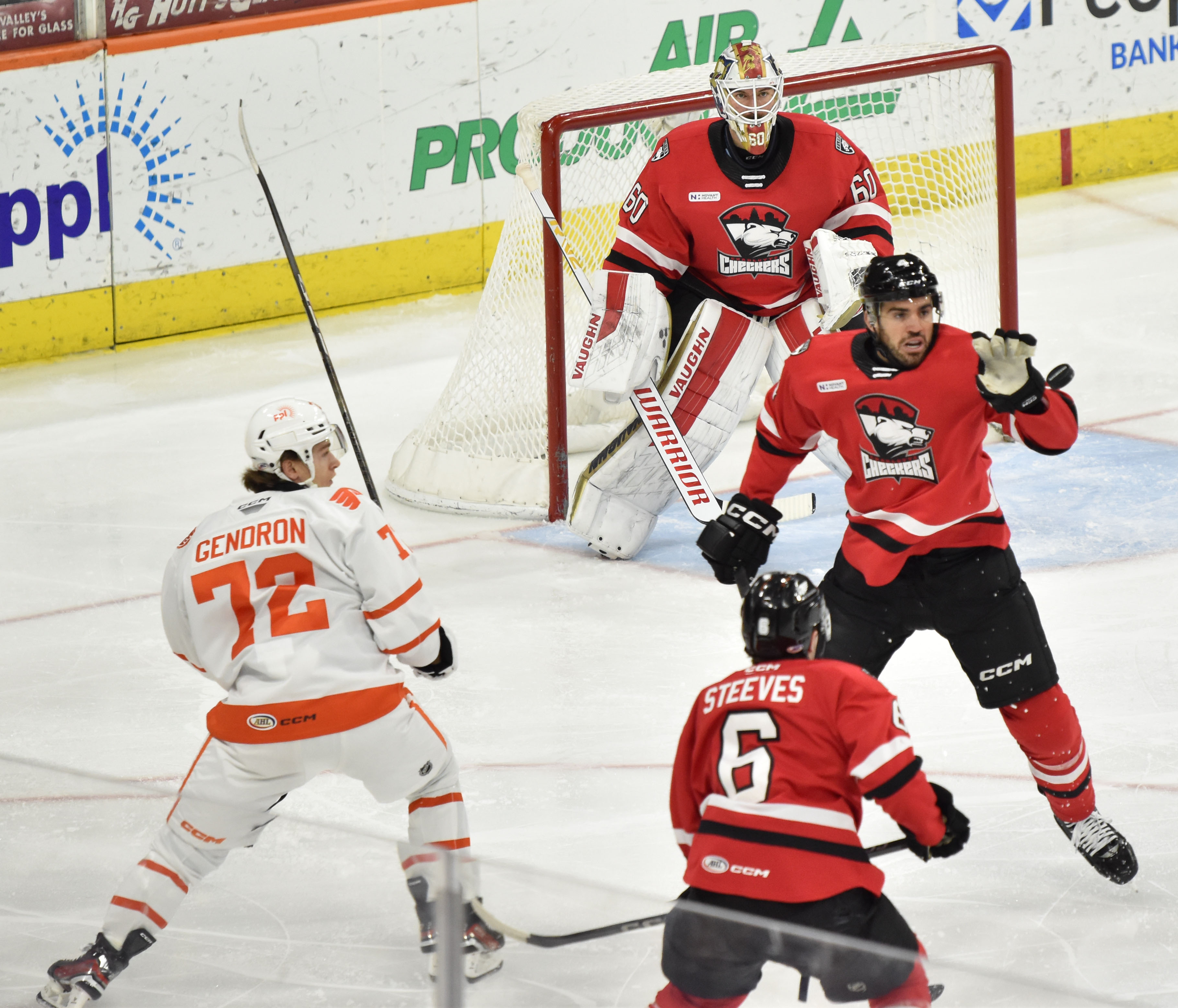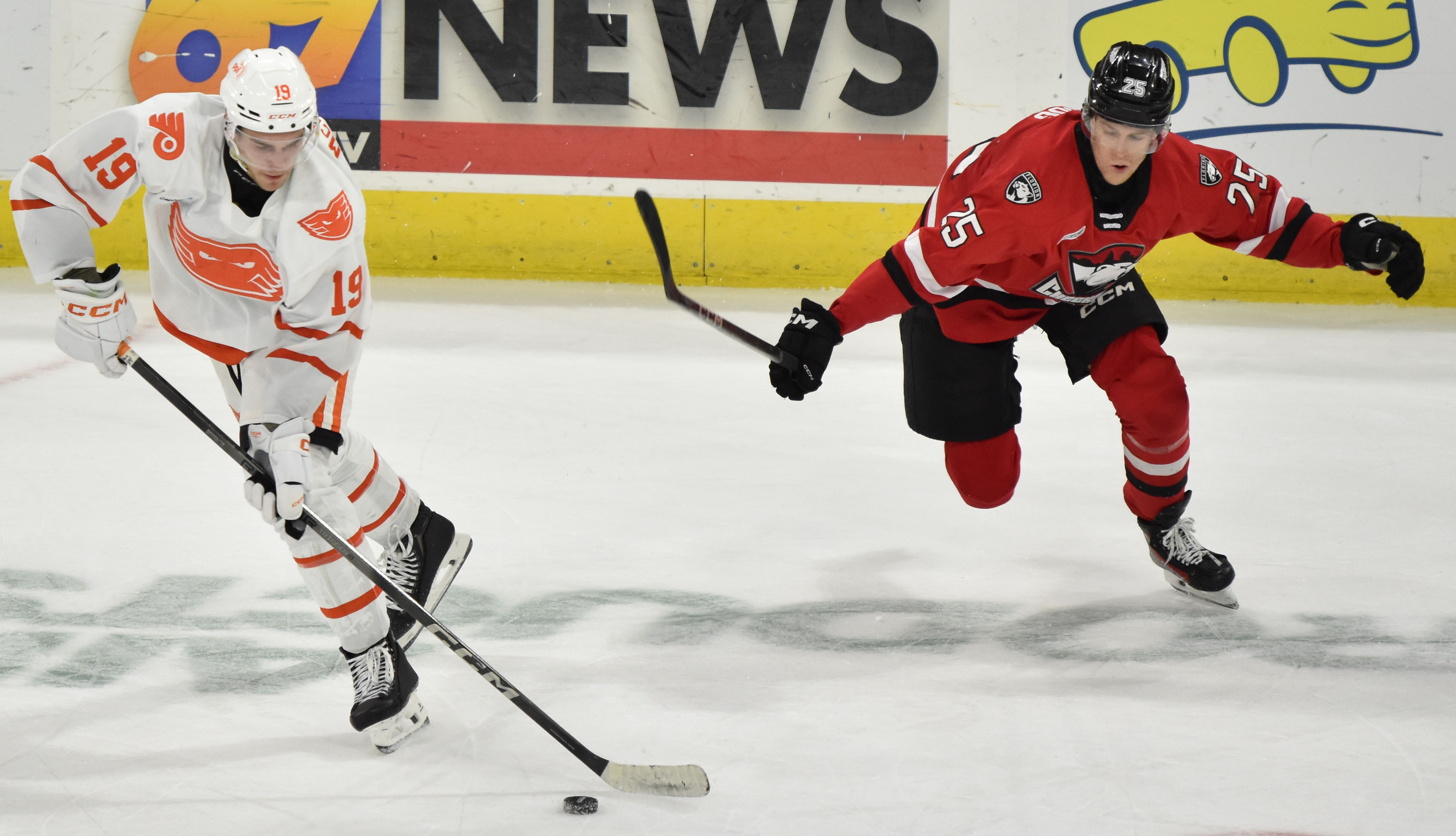 But the Phantoms couldn’t find the equalizer and Charlotte put together two more goals down the feisty stretch to finish the win. Riley Hughes (1st) scored out in front after Cal Petersen scrambled to his left for a strong save on the back-door. And Oliver Okular (10th) tucked in his power-play marker a few minutes later from the right of the cage to seal the deal.