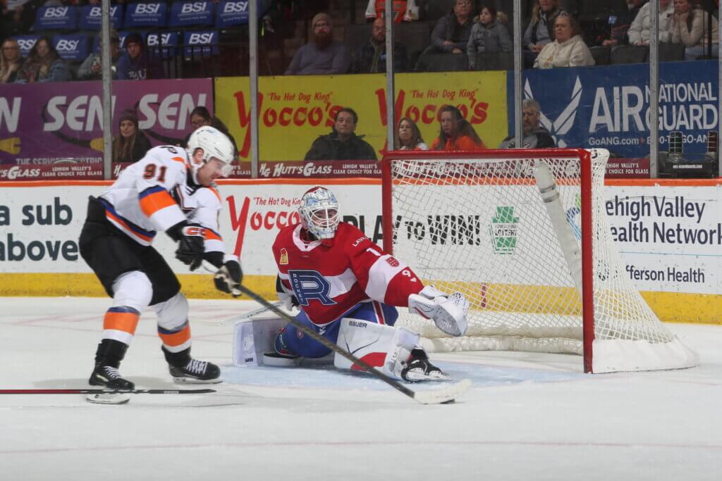 Lehigh Valley (11-6-3) was even inches away from a phenomenal win of its own. With just one second left in overtime. Alex Bump rushed straight into the Laval zone and shot for the right post. Jacob Fowler barely got enough of the monster blast to change its direction. The puck almost rolled into the net anyway but missed by just inches to keep the Rocket alive.