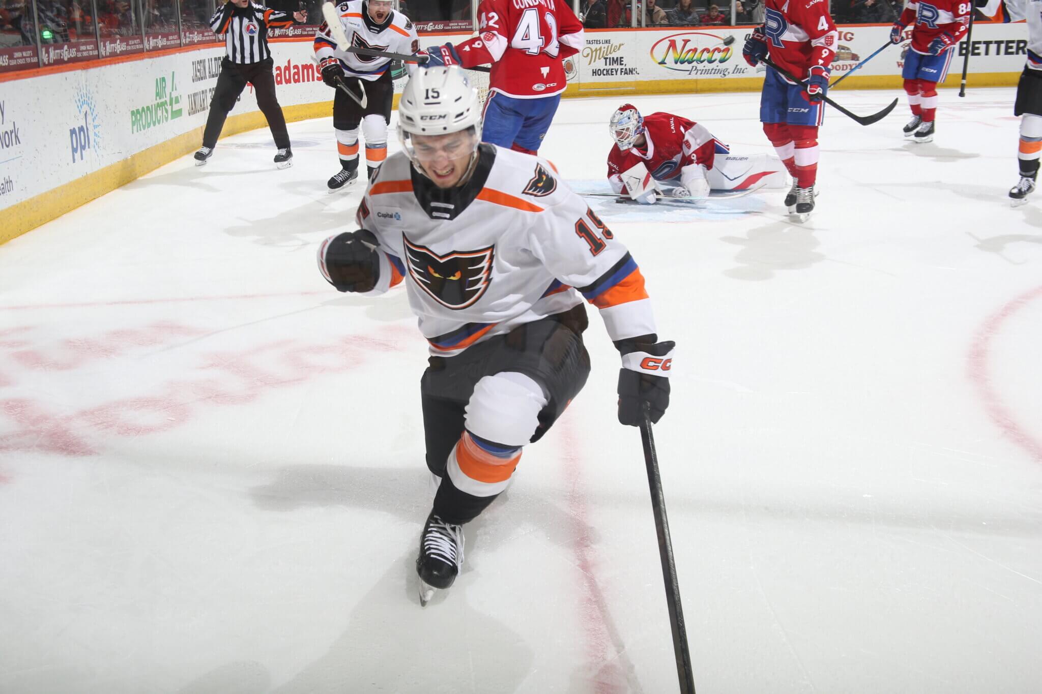 It was a fast, emotional game largely dominated by special teams. The night featured momentum swings in both directions and showcased the resilience that has been a hallmark of Lehigh Valley’s play in recent weeks. Trailing 3-1 in the second period, it was Christian Kyrou’s (4th) buzzer-beater on a 5-on-3 power play that got the comeback jump-started for the Phantoms. Carl Grundstrom (7th) tied it early in the third and Lane Pederson (7th) put the Phantoms ahead to thrill the crowd. But the Rocket weren’t done and they had just enough gas in the tank to find the tying goal and then push through for the victory.