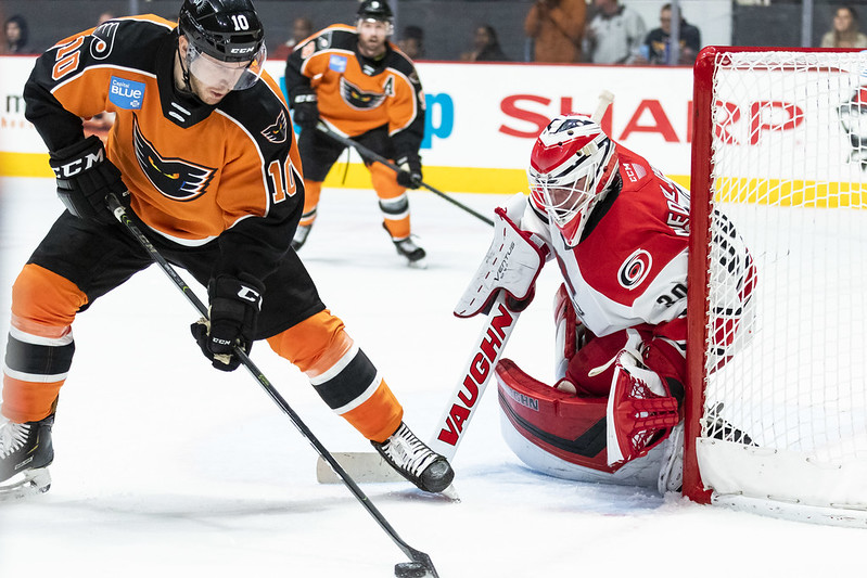 J-F Berube recorded a couple big stops at the end to kill a late 6-on-4 opportunity for the Checkers in preserving his first win as a Phantom. Berube finished the evening with 29 saves on 31 shots. Janne Kuokkanen (2nd) and Jake Bean (1st) scored for Charlotte while Alex Nedeljkovic stopped 39 of 42 Phantoms shots.