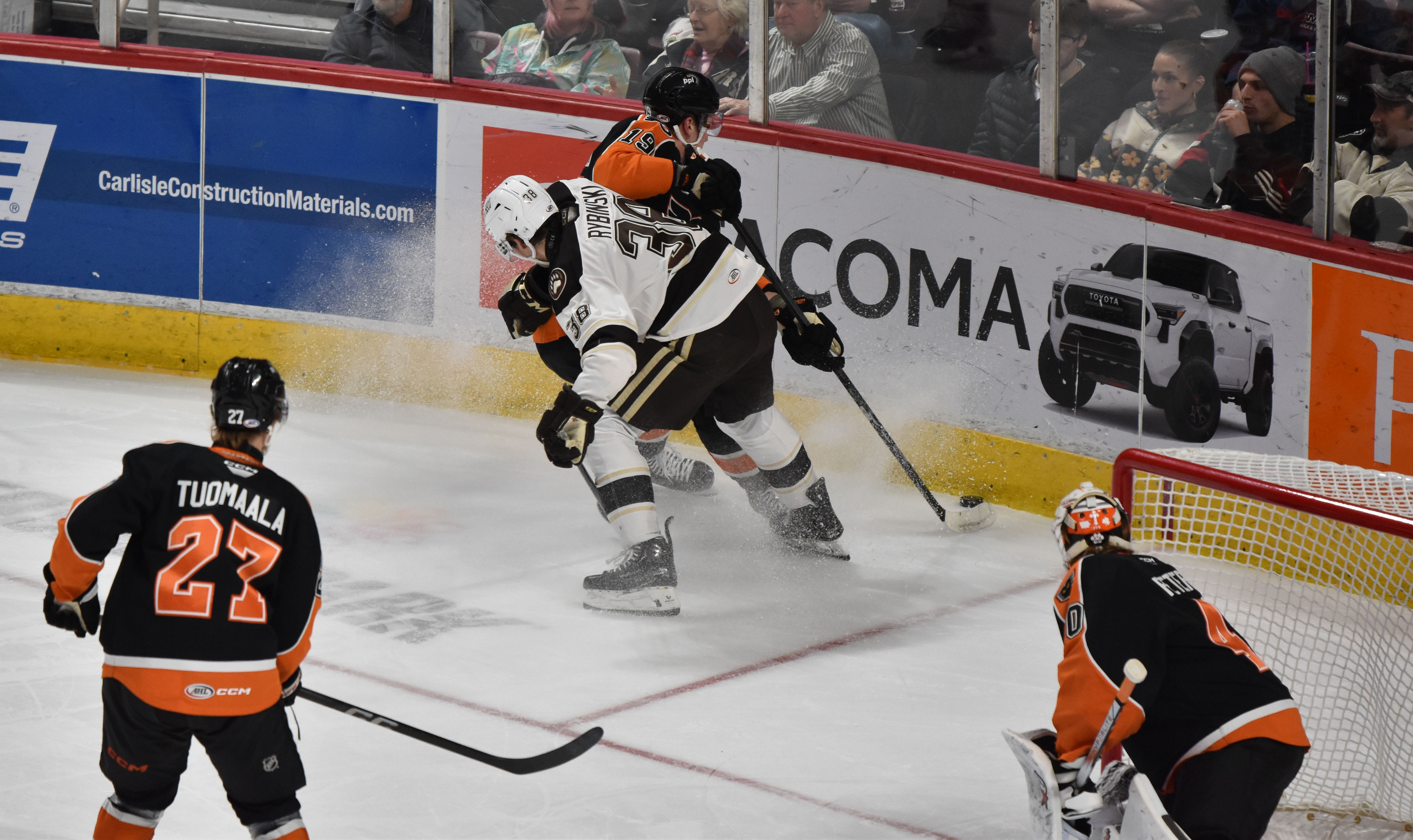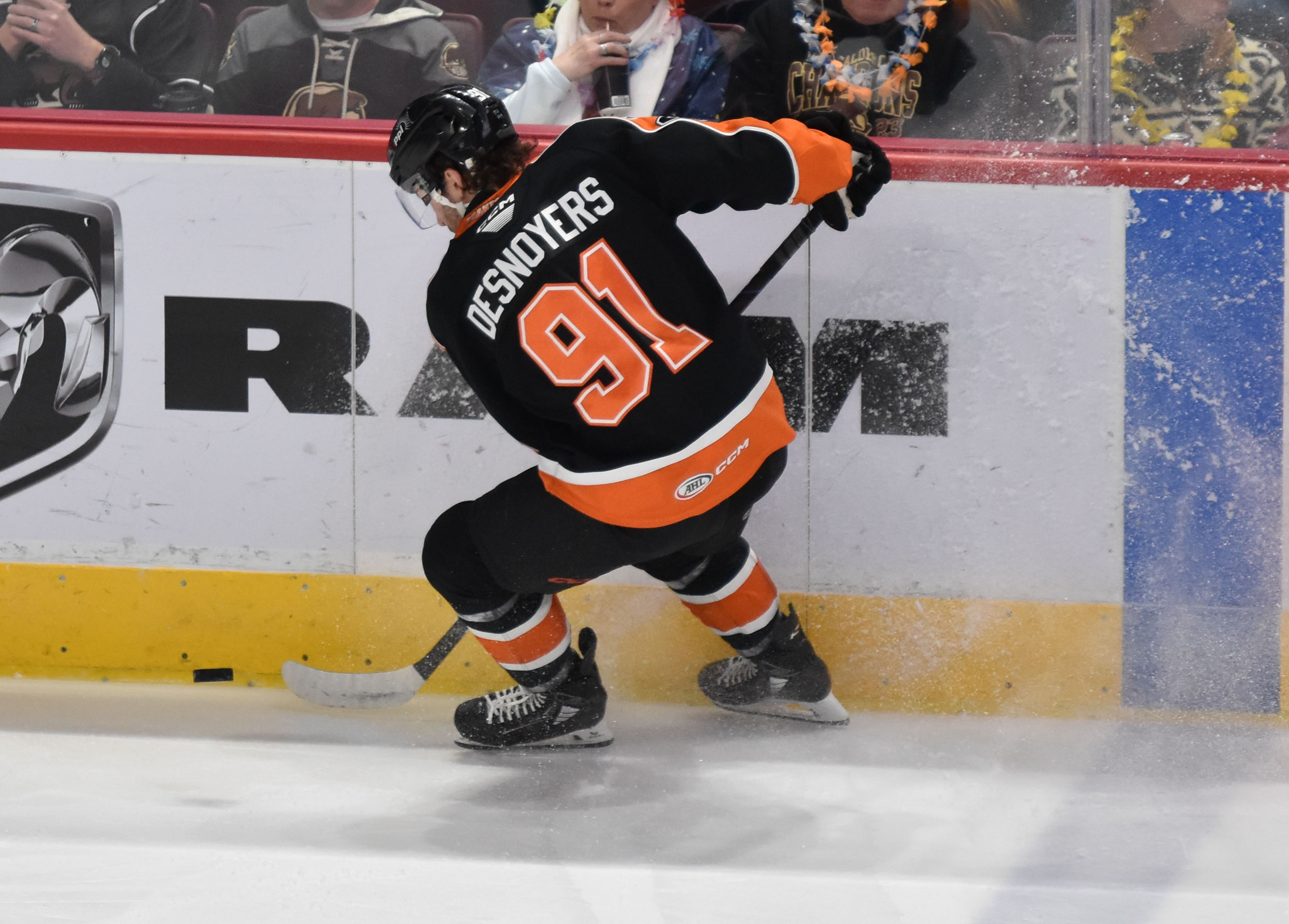 The Phantoms racked up consecutive goals just 39 seconds apart to break the tie beginning with Desnoyers (3rd) putting home the rebound of a Louie Belpedio shot that was nudged back to the slot by Samu Tuoaamala at 12:47 into the contest.