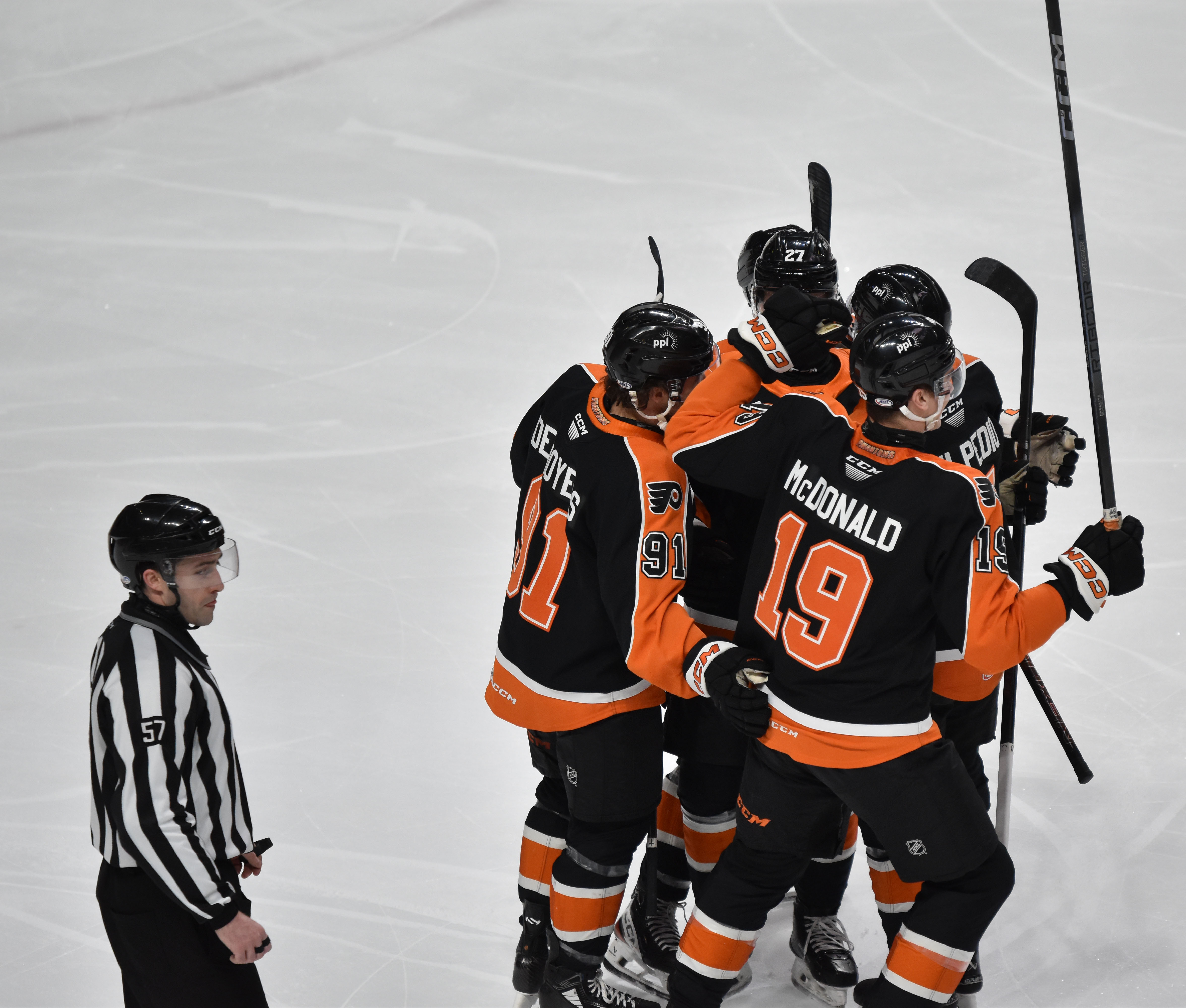 The Phantoms opened the scoring just 2:444 into the game on McDonald’s point-shot that missed goaltender Hunter Shepard on a drive that might have been accidentally deflected en route by a Hershey defender. Louie Belpedio and Massimo Rizzo both recorded the first of their two helpers on the night.