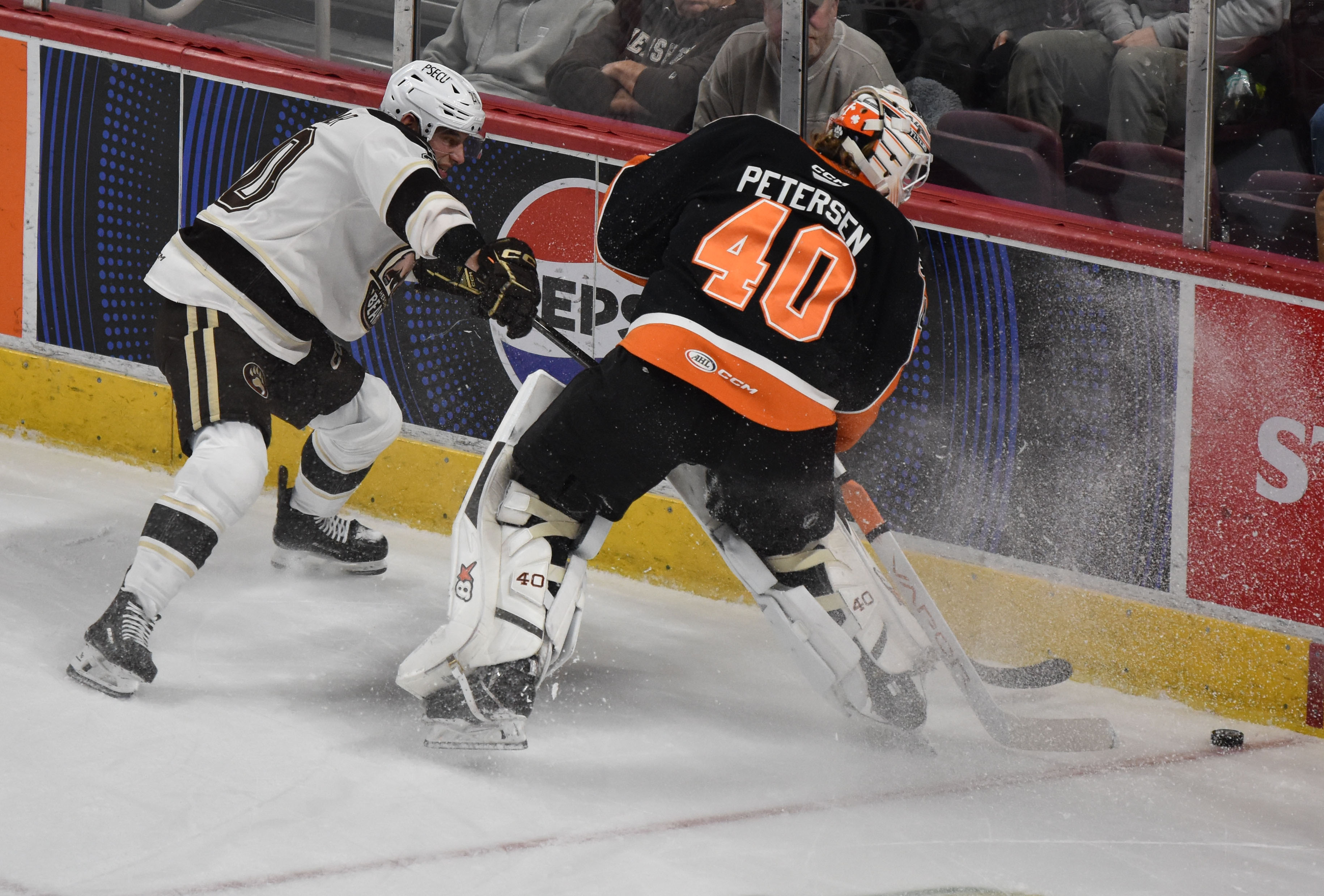 Next up, it was penalty-kill time for the Phantoms. Almost six consecutive minutes down a man meant trouble for Lehigh Valley but the penalty kill came through in a big way. And so did Petersen whose diving save to his left on a Sgarbossa one-timer knocked the paddle out of his hands. Petersen had some hairy moments playing without the paddle which included a Hershey player continuing to nudge the stick out of his reach. Eventually, the Phantoms returned to full strength and still had the lead.