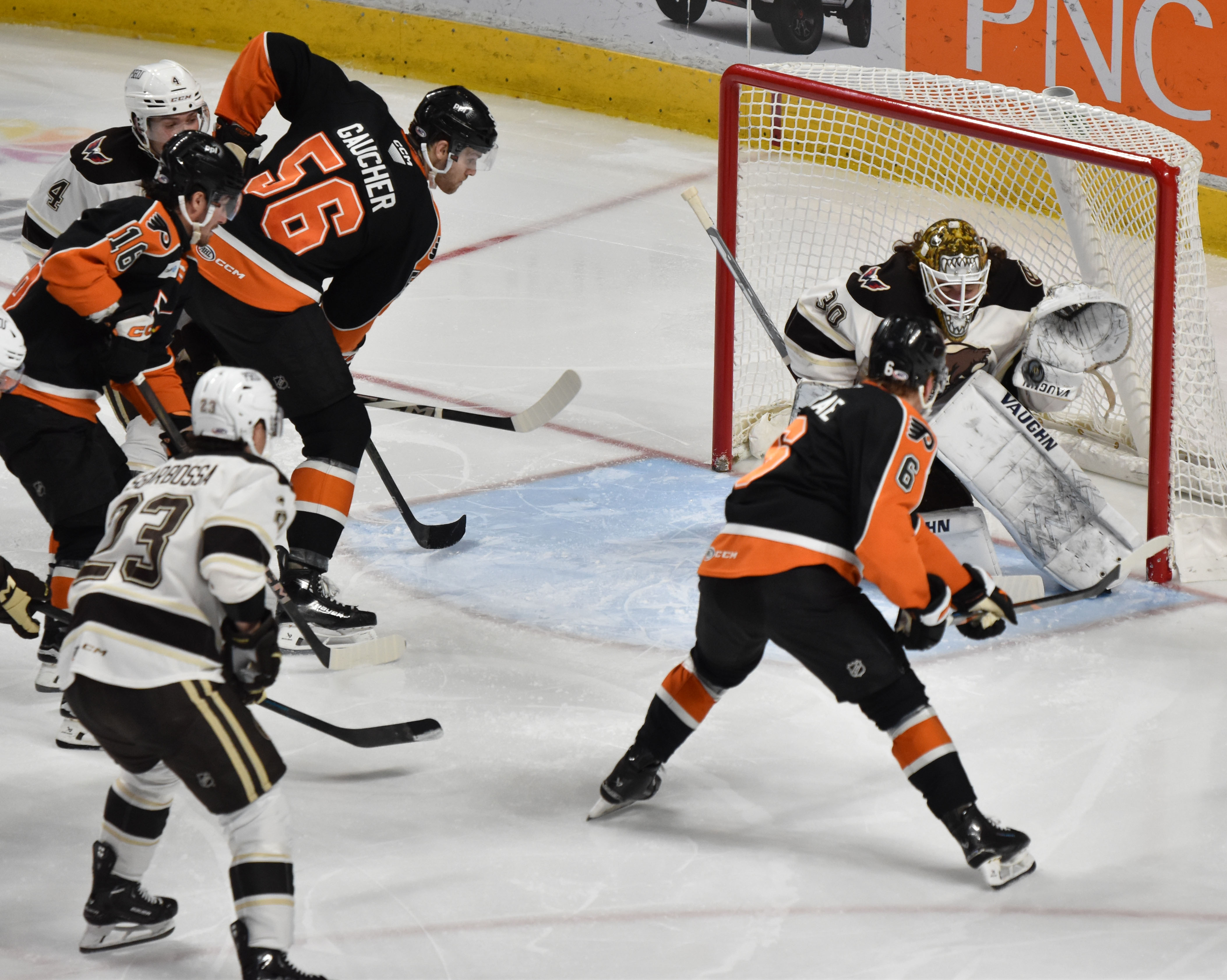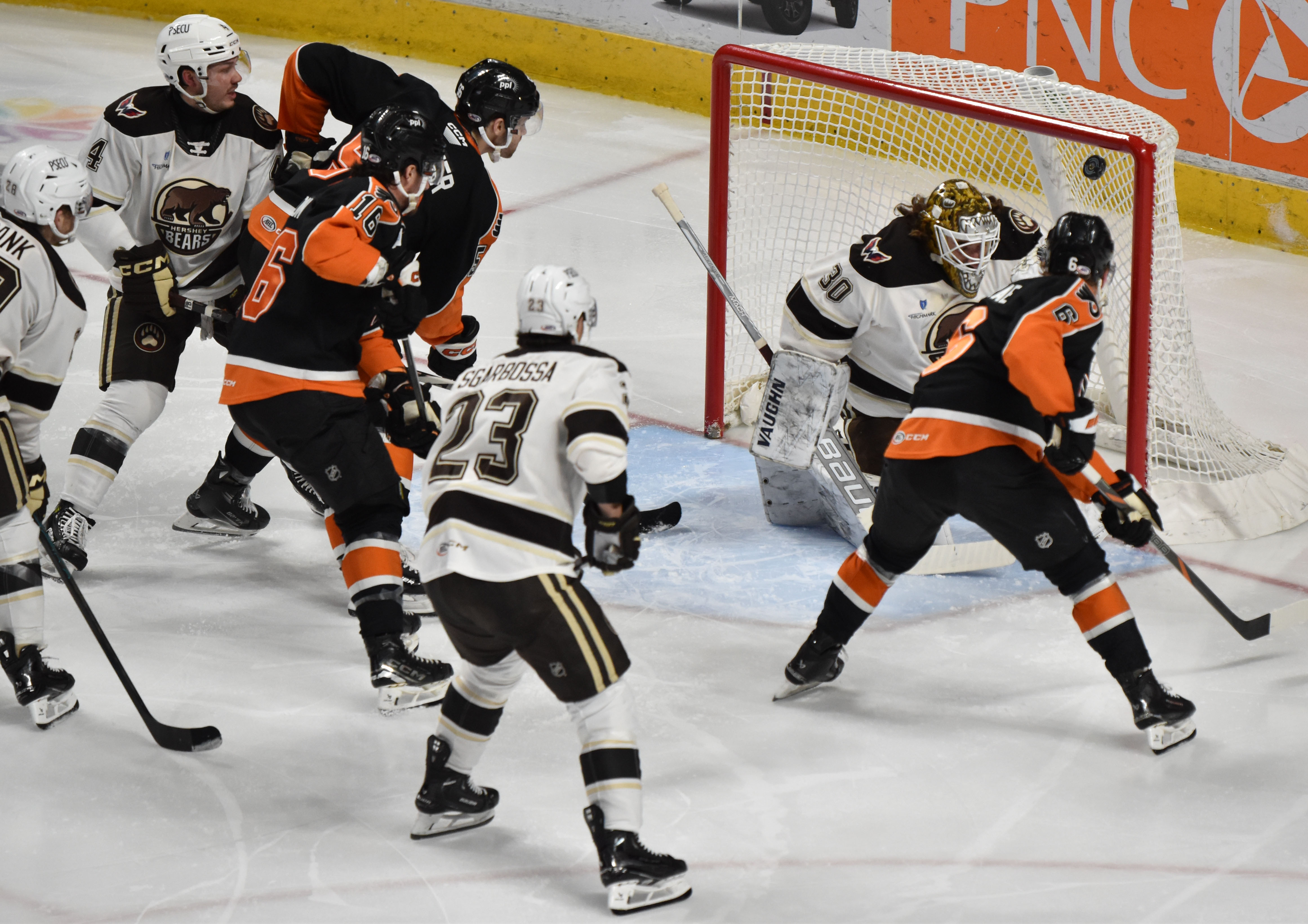 Hunter McDonald (2nd), Elliot Desnoyers (3rd) and Ethan Samson (6th) all scored in the team’s highest-scoring opening period of the season and then Emil Andrae (1st) and Jacob Gaucher (14th) found the back of the net in the second period as Lehigh Valley boosted its lead to 4-1 and 5-2. But the Bears responded with a pair of goals by Mike Sgarbossa (6th, 7th) to force the Phantoms to sweat it out all the way to the finish.