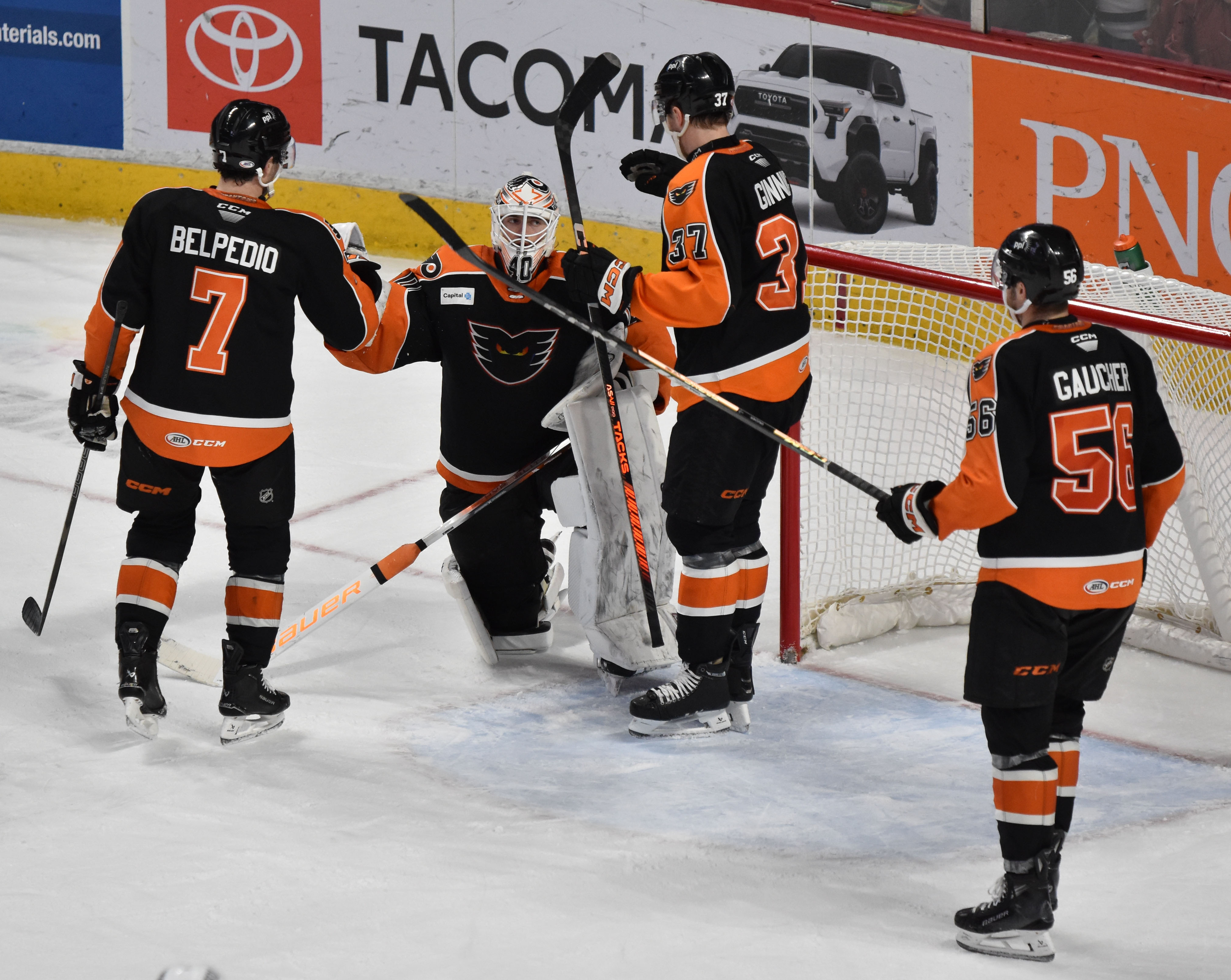 The Phantoms racked up consecutive goals just 39 seconds apart to break the tie beginning with Desnoyers (3rd) putting home the rebound of a Louie Belpedio shot that was nudged back to the slot by Samu Tuoaamala at 12:47 into the contest.
