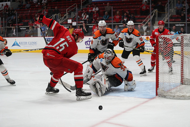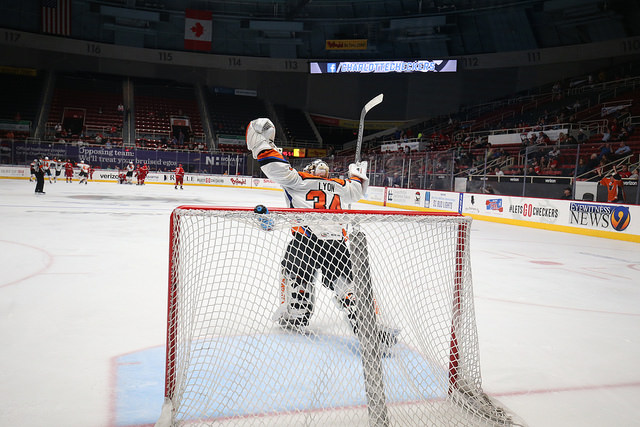 Alex Lyon recorded 94 saves on 95 shots which was the second-most in AHL history. The Phantoms took a 3 games to 1 lead in the series. And both of the drained teams are certainly happy that there are two days off before Game 5 of the series on Saturday night at 6:00 p.m. in Charlotte.