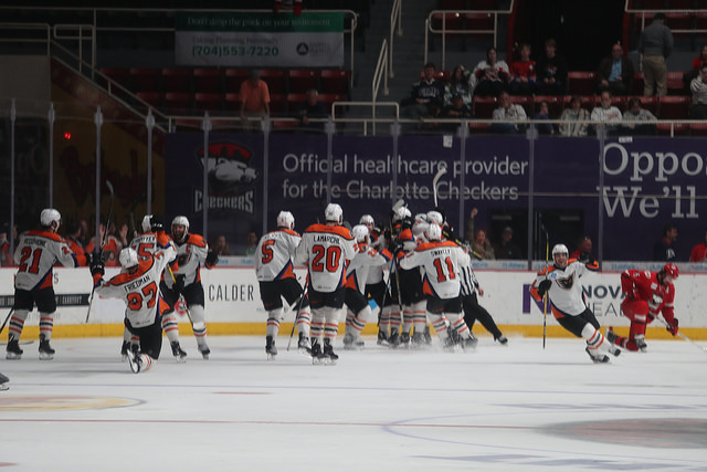 Charlotte, N.C. – Alex Krushelnyski scored at 6:48 into the fifth overtime finally ending the longest game in the 82-year history of the American Hockey League at 1:09 a.m. capping an incredible night (and early morning) of hockey in Charlotte. Colin McDonald won the puck in the right corner and connected with an open Cole Bardreau behind the net who found Krushlenyski open in the slot for the one-timer past the blocker of Alex Nedeljkovic thus triggering an exuberant celebration from the overjoyed Phantoms.