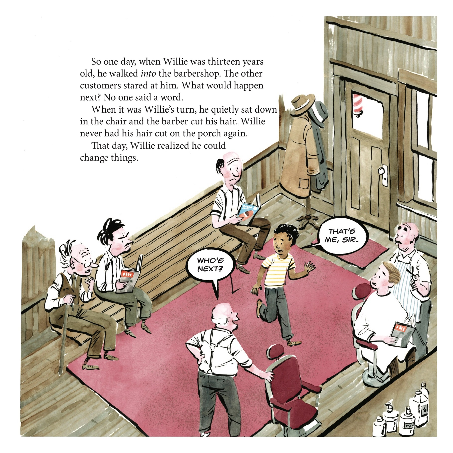 The way MacLeod writes about the discrimination O’Ree endured while living in segregation is intentional and allows children to understand the concept while still protecting them from harmful language before they are at an age where they can learn about slavery and racism further in depth. The pages illustrate some of the discrimination O’Ree and other Black people at the time had to face, such as segregation of bathrooms and hotels. MacLeod pairs this fact of life with the story of O’Ree establishing change for himself by getting his hair cut inside the barbershop where he was previously not allowed or expected to venture.