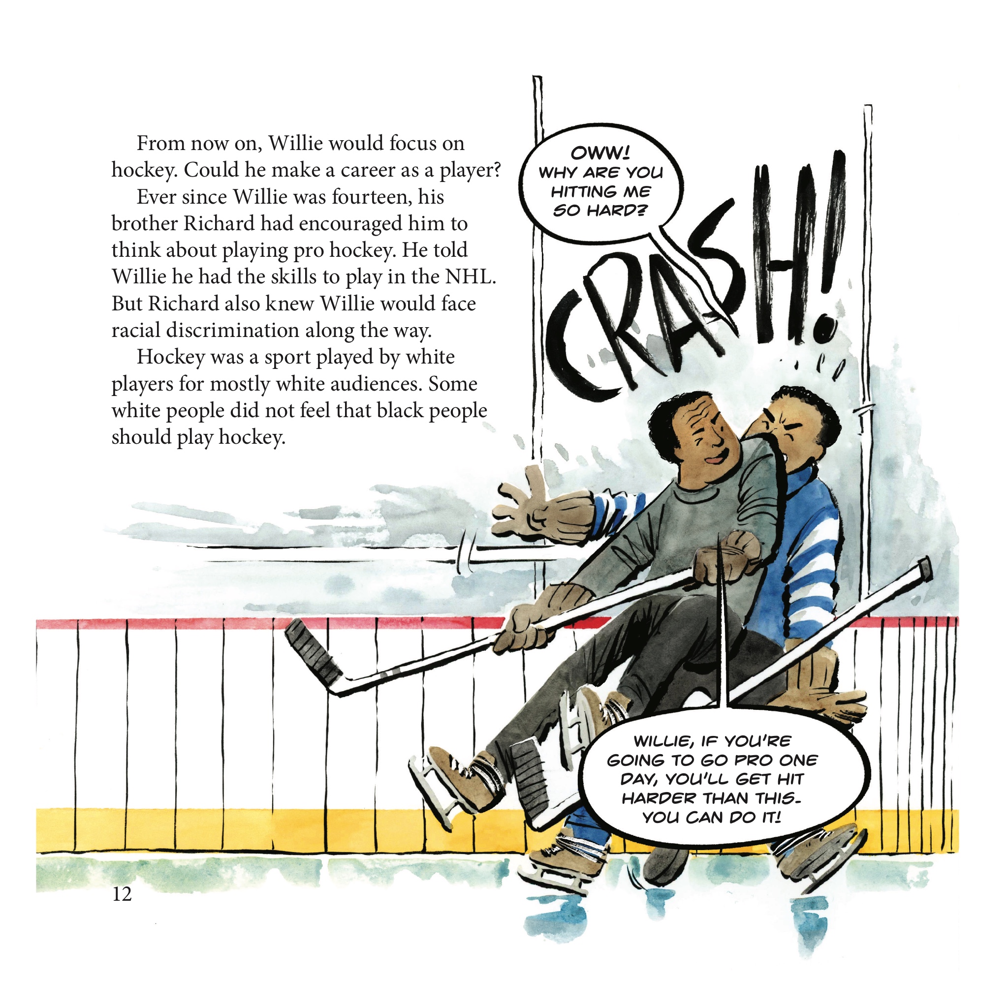 There is a strong emphasis in the importance of community support portrayed in this book, whether it is from O’Ree’s family and close community encouraging his love of hockey while teaching him of the hardships he’d face with other players, or in the community he built after he retired by helping marginalized children play hockey and learn useful life skills.