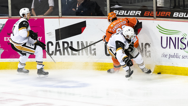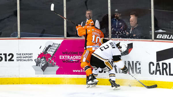 The penalties continued to flow early in the second period and Sheffield tied things up under two minutes in after the re-start, Tanner Eberle (21.54) hitting the back of the net on a broken play in front of Carr.